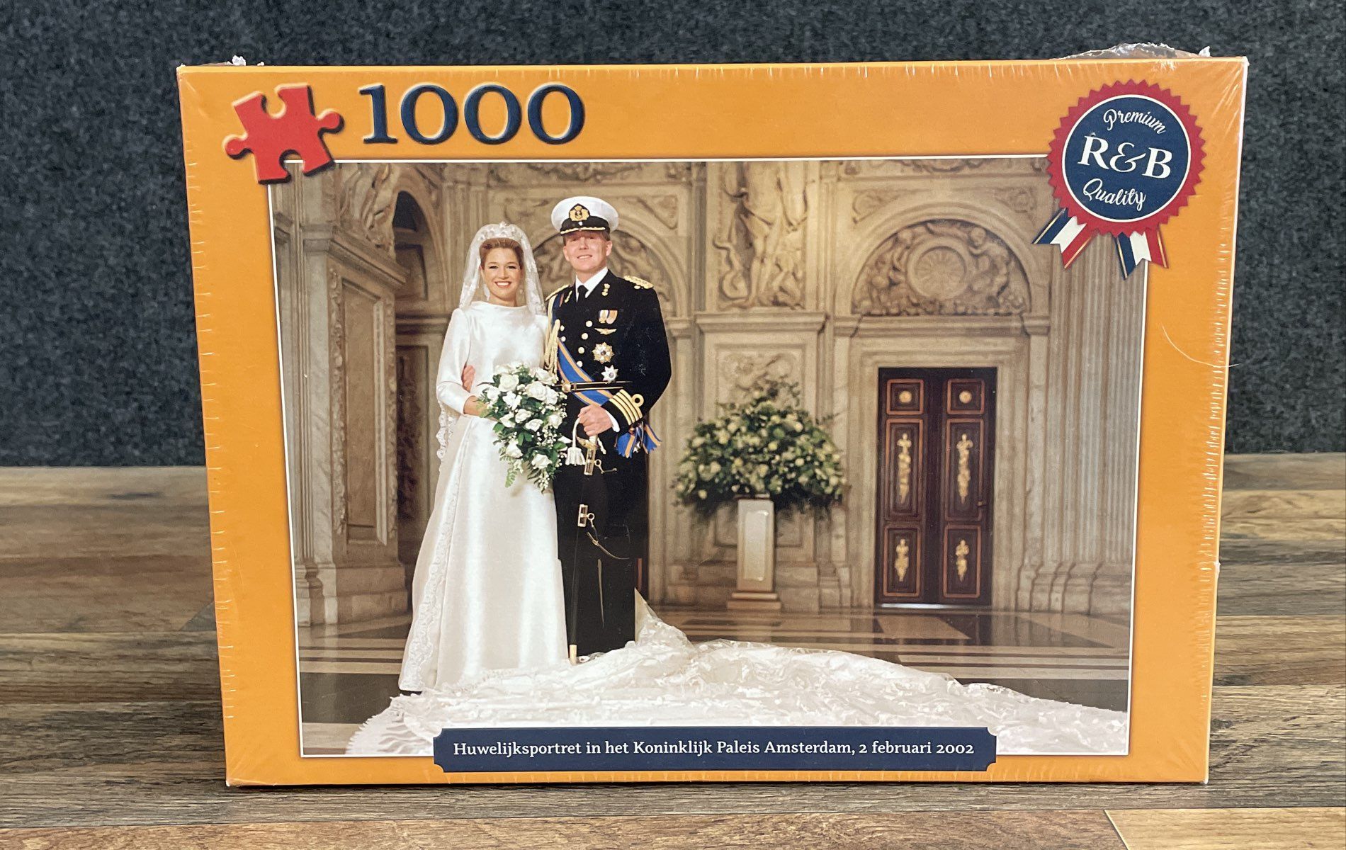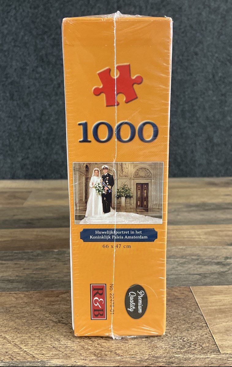 This is a collectible 1000-piece jigsaw puzzle from 2002, commemorating the royal wedding of then-Prince Willem-Alexander and Máxima Zorreguieta Cerruti of the Netherlands. The puzzle features their official wedding portrait taken at the Royal Palace in Amsterdam. This is an excellent find for collectors of European royal family memorabilia or avid puzzle enthusiasts.
