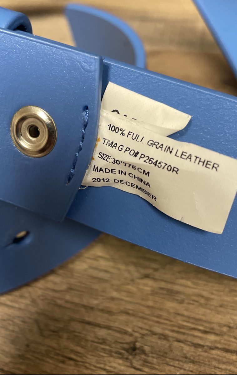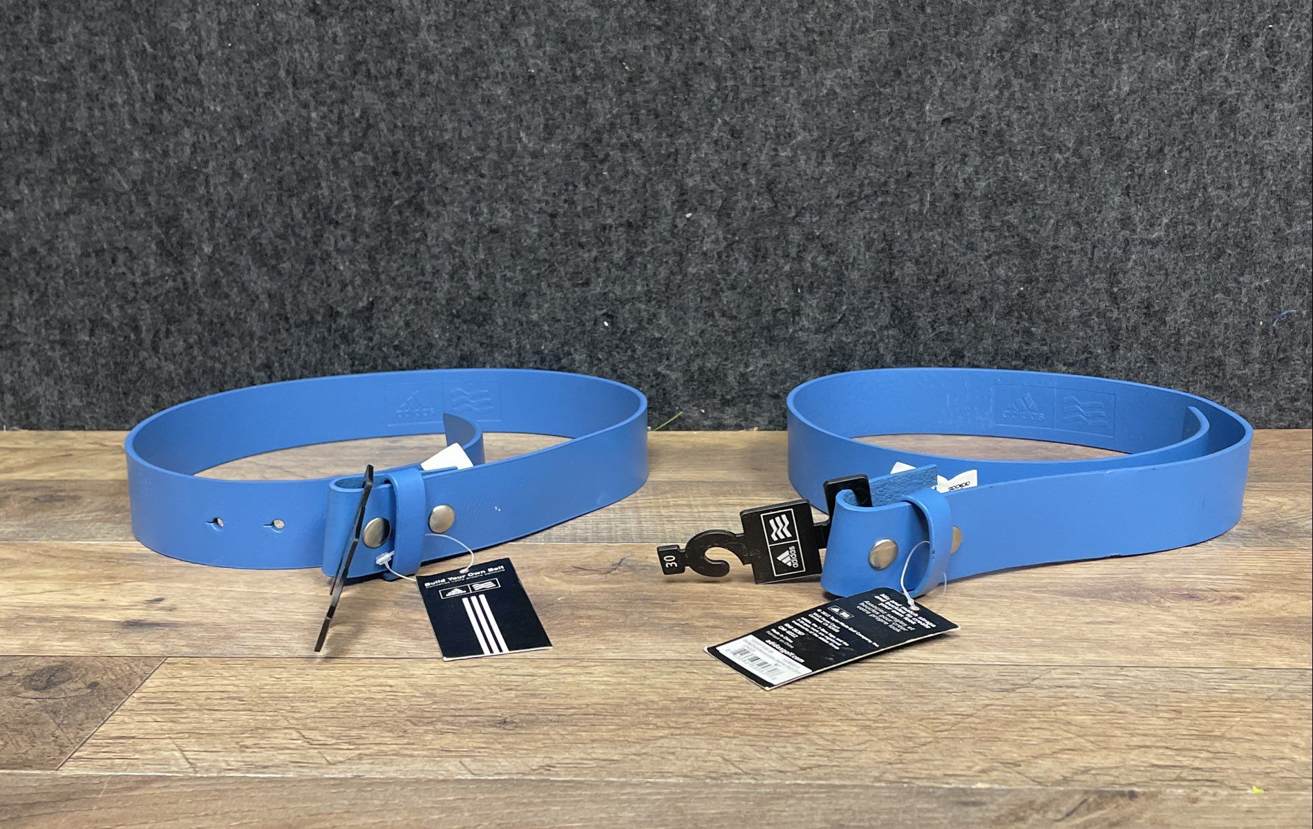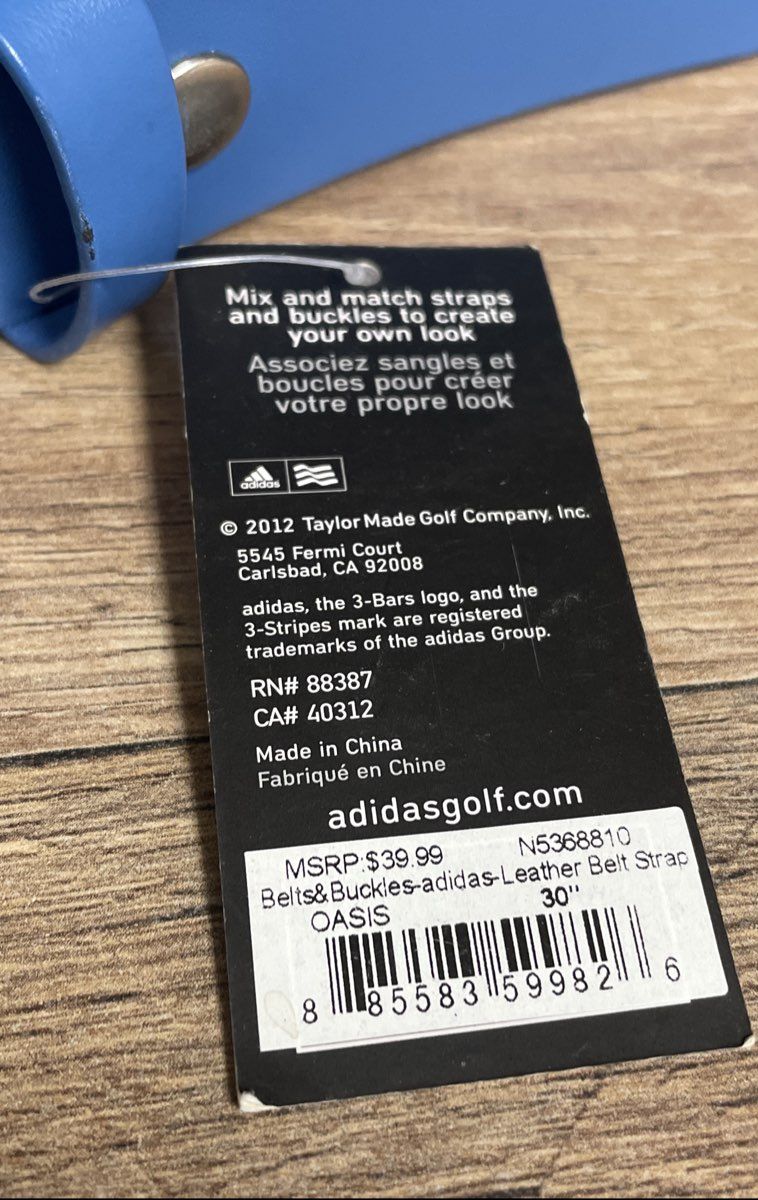This lot includes two new-with-tags Adidas Golf belt straps from 2012, part of the mix-and-match "Belts&Buckles" collection. Both straps are crafted from 100% full-grain leather in a vibrant light blue "Oasis" color. One strap comes with its original black metal buckle, while the other is a replacement strap only. Perfect for customizing your golf attire.
