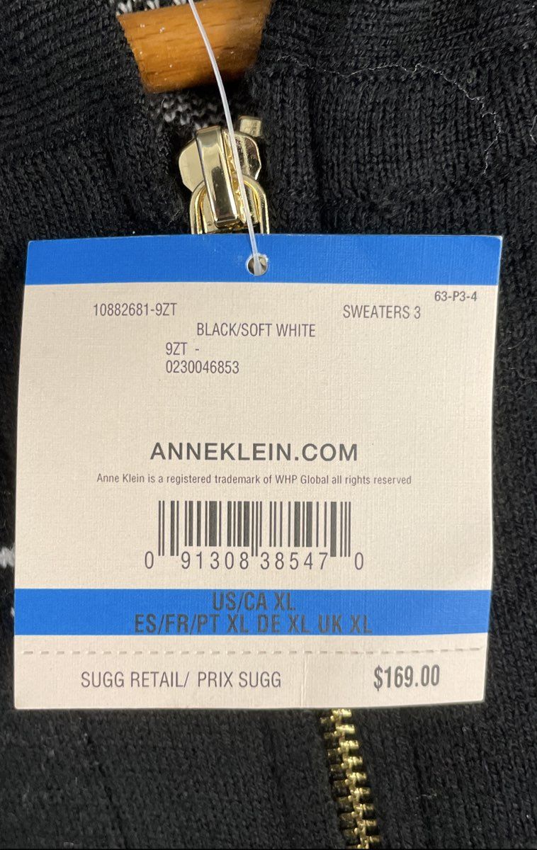 This Anne Klein cardigan is presented in new-with-tags condition. It is crafted from a comfortable knit fabric in black with a contrasting soft white dashed windowpane pattern. The design features a full-zip front with a distinctive gold-tone logo zipper pull, an attached hood, and three-quarter length sleeves. A versatile layering piece for casual or office wear.