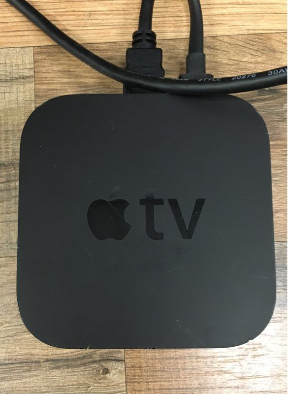 An Apple TV digital media player designed to stream content to a high-definition television. Based on the form factor, this unit appears to be a 2nd or 3rd generation model, which brought 720p/1080p streaming and the compact black enclosure to the product line. It allows users to play digital content from a computer, the iTunes Store, or stream from various online services via a Wi-Fi or Ethernet connection. This sale includes the Apple TV unit, a power cord, and an HDMI cable.