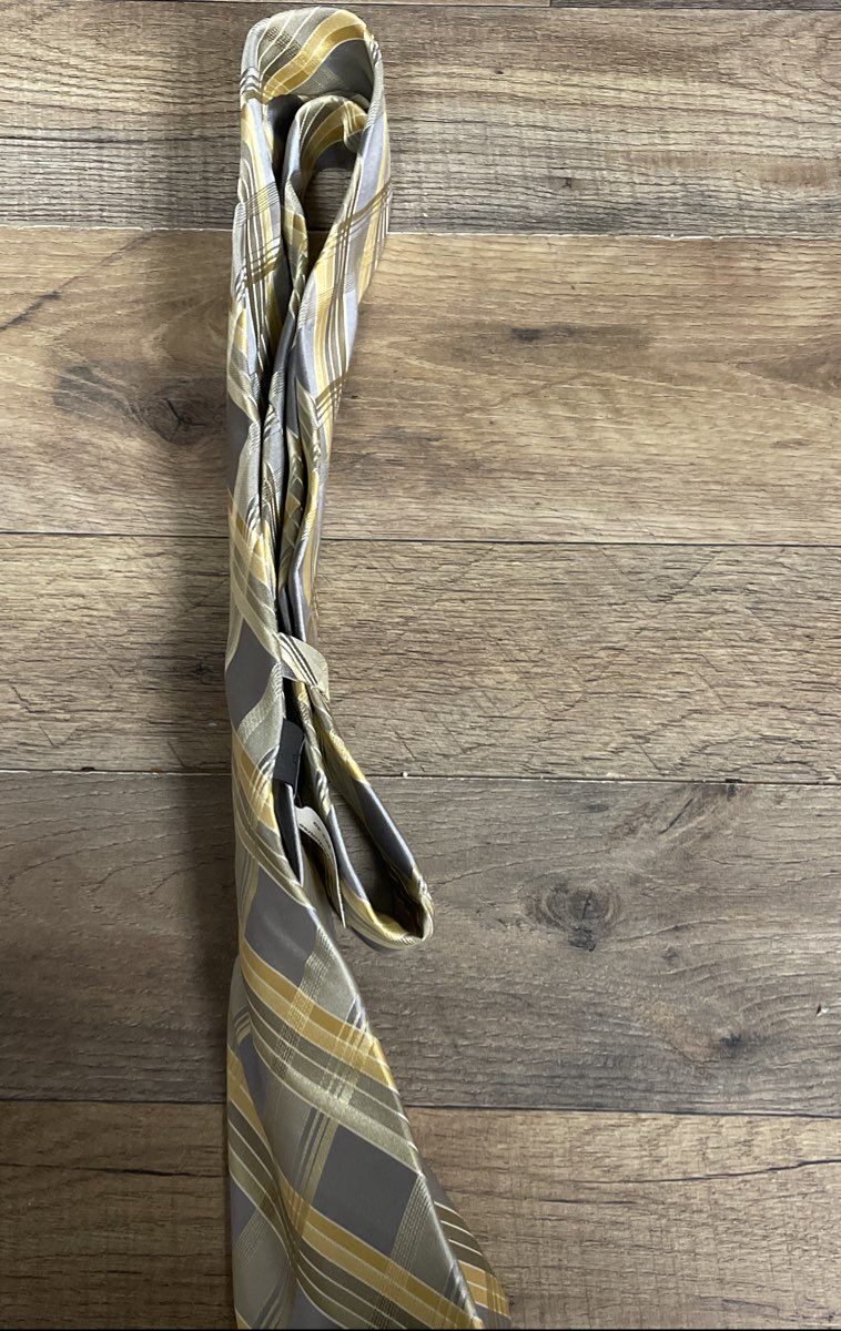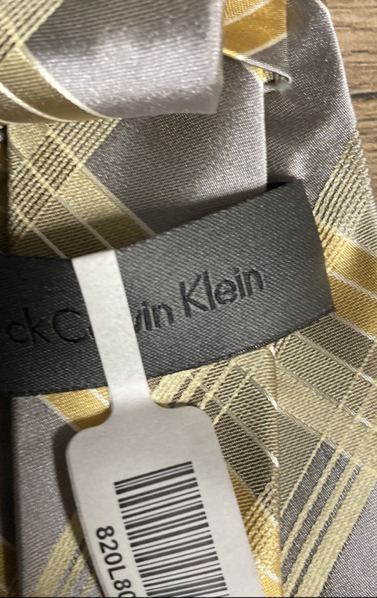 Calvin Klein Men's Necktie Tie Gray Gold Yellow Plaid Check Pattern