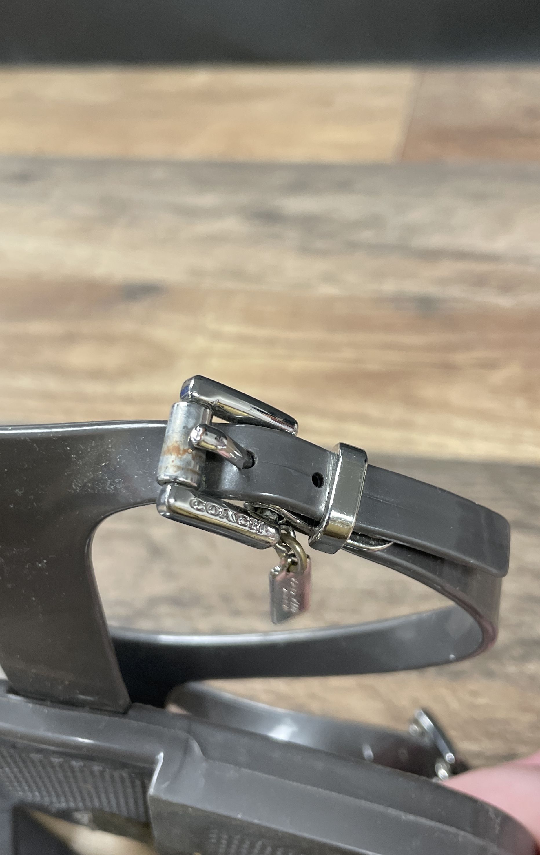 • Adjustable ankle strap with silver-tone buckle and Coach padlock charm