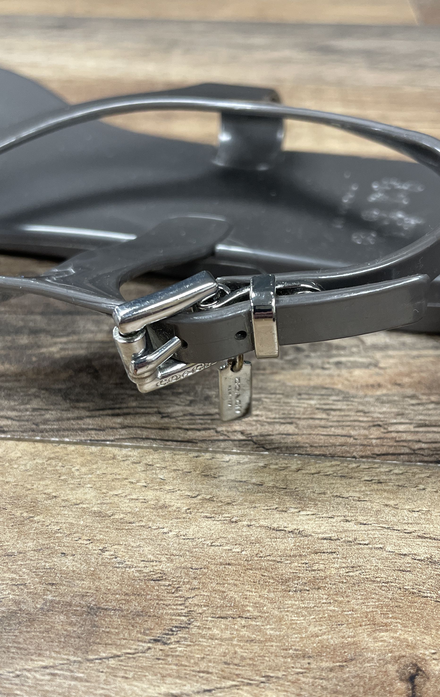 A classic pair of Coach Plato sandals, crafted from a durable and waterproof grey PVC material. This thong-style sandal features an adjustable ankle strap for a secure fit, accented with a silver-tone buckle and a signature Coach padlock charm. The flexible, flat design makes them a comfortable and practical choice for casual or beach wear.