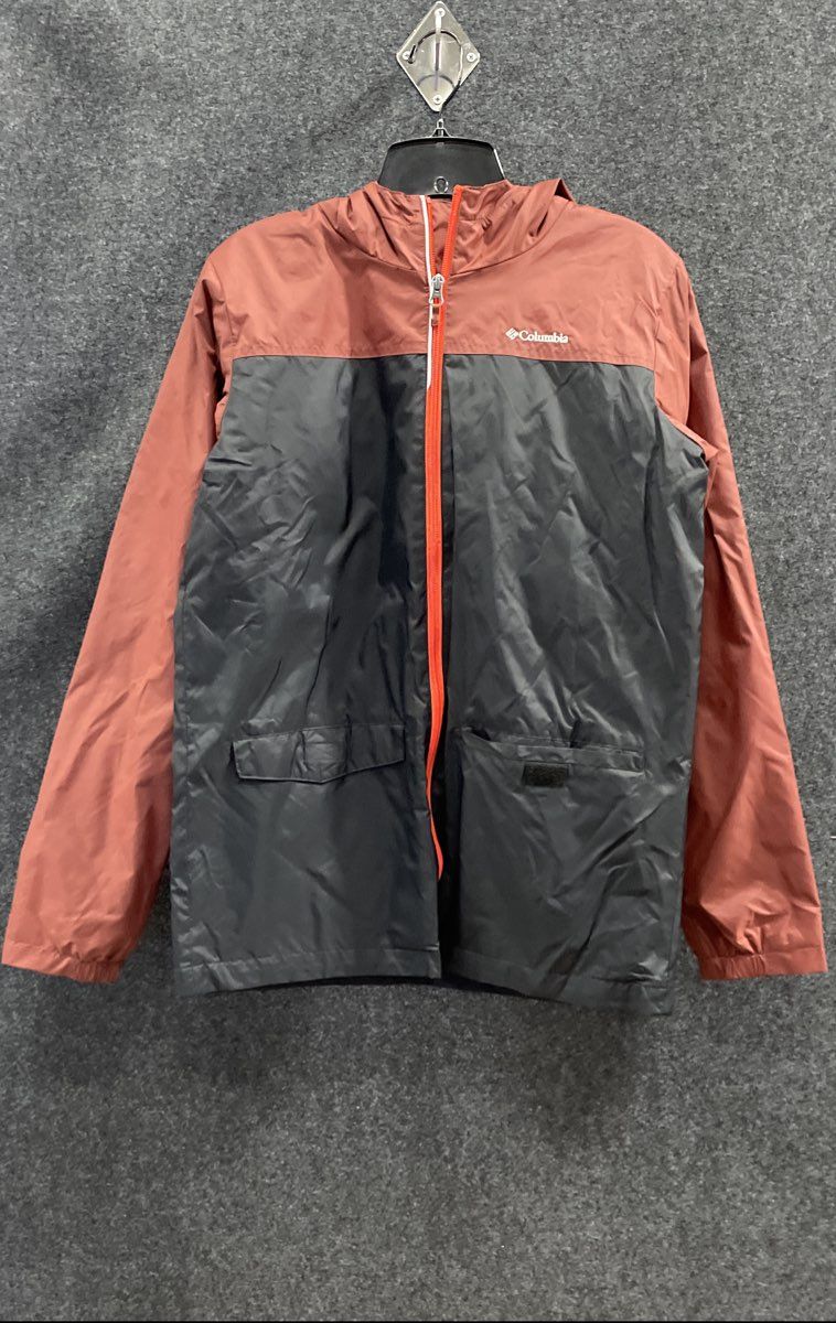 This Columbia youth jacket features a durable nylon shell in a striking reddish-brown and black colorblock design. It is equipped with a full-zip front closure highlighted by a bright orange zipper, and a soft fleece-lined hood and upper body for added warmth. The lightweight construction makes it an ideal windbreaker for various weather conditions. Features two front flap pockets with hook and loop closures for secure storage.