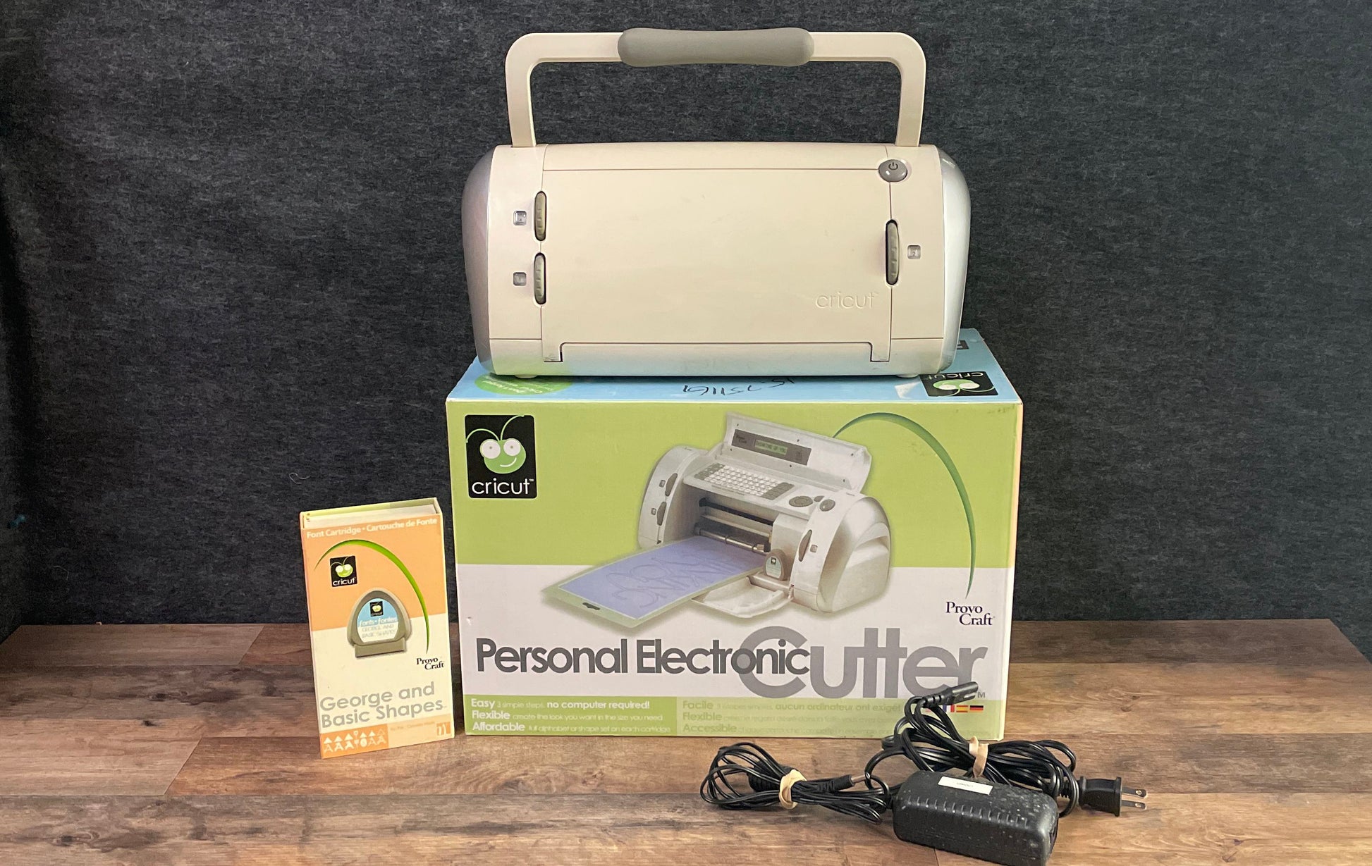 This is the original Cricut Personal Electronic Cutter, Model CRV001, by Provo Craft. This machine allows users to cut intricate shapes and fonts using physical cartridges without requiring a computer. This listing includes the cutter, its original power adapter, the "George and Basic Shapes" starter cartridge set, and the original retail box. The cartridge set comes complete with the cartridge, keyboard overlay, and spiral-bound idea book, all in the original case.