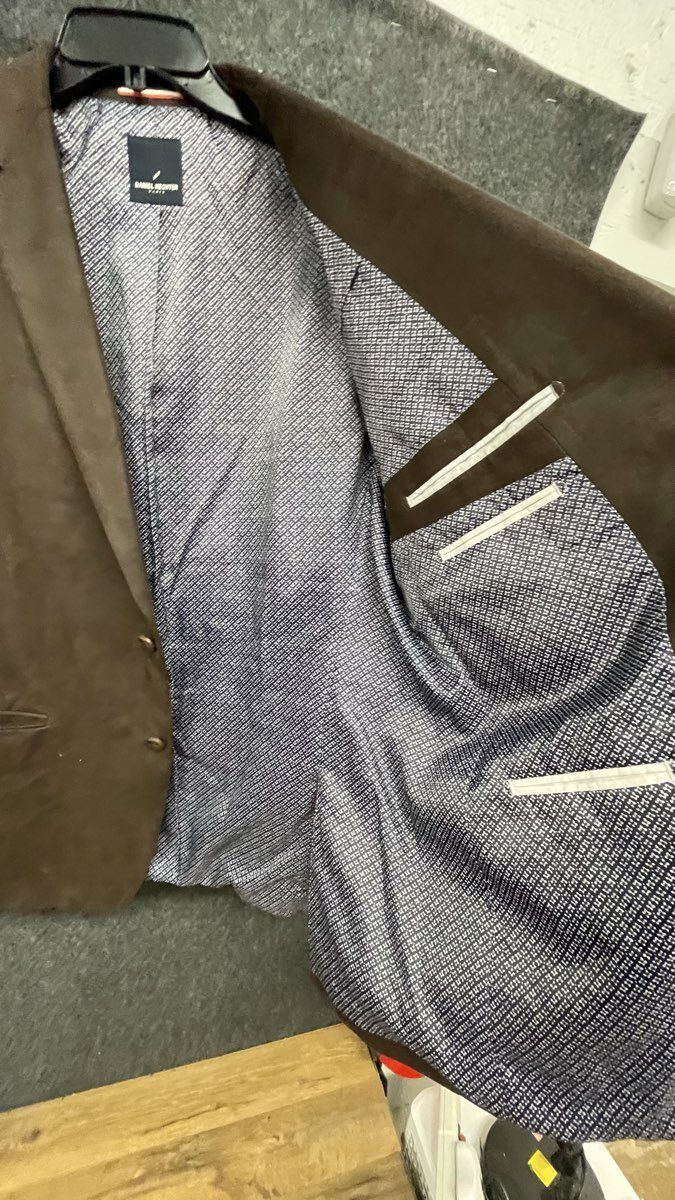 A classic men's sport coat from Daniel Hechter Paris, crafted from a soft, brown faux suede fabric. This single-breasted blazer features a traditional two-button closure and notched lapels. The interior is fully lined with a distinctive blue and white geometric print fabric, adding a touch of modern style and includes several welt pockets for functionality.