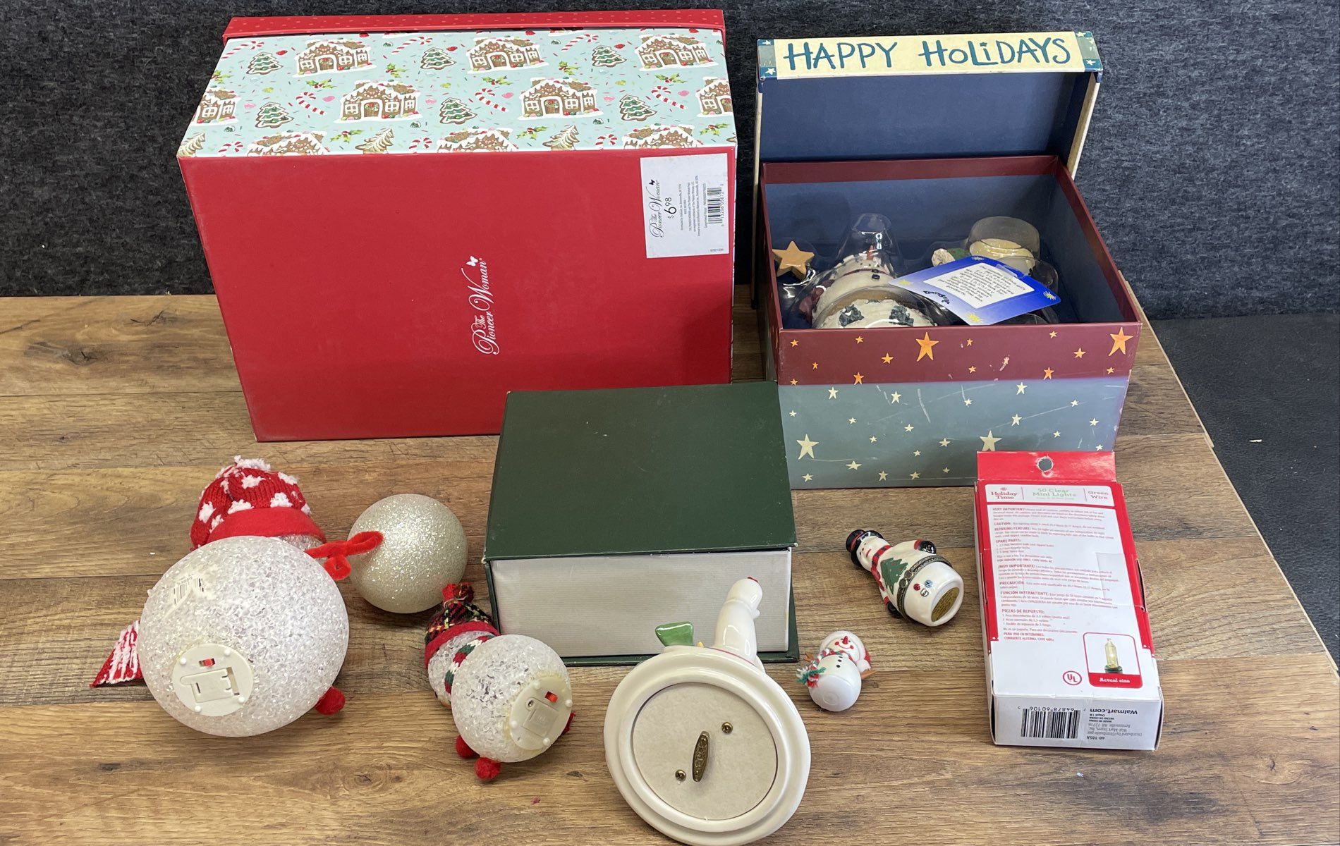 Condition: Used. A mixed lot of new and pre-owned items. The Department 56 Snowbabies and Earthshine Candle set appear new in their original, opened boxes. The mini lights are new and sealed. Other figurines are in very good used condition with minimal wear. The storage boxes show signs of use and storage, including some creasing. Please see photos for a detailed look at all included items and their condition.