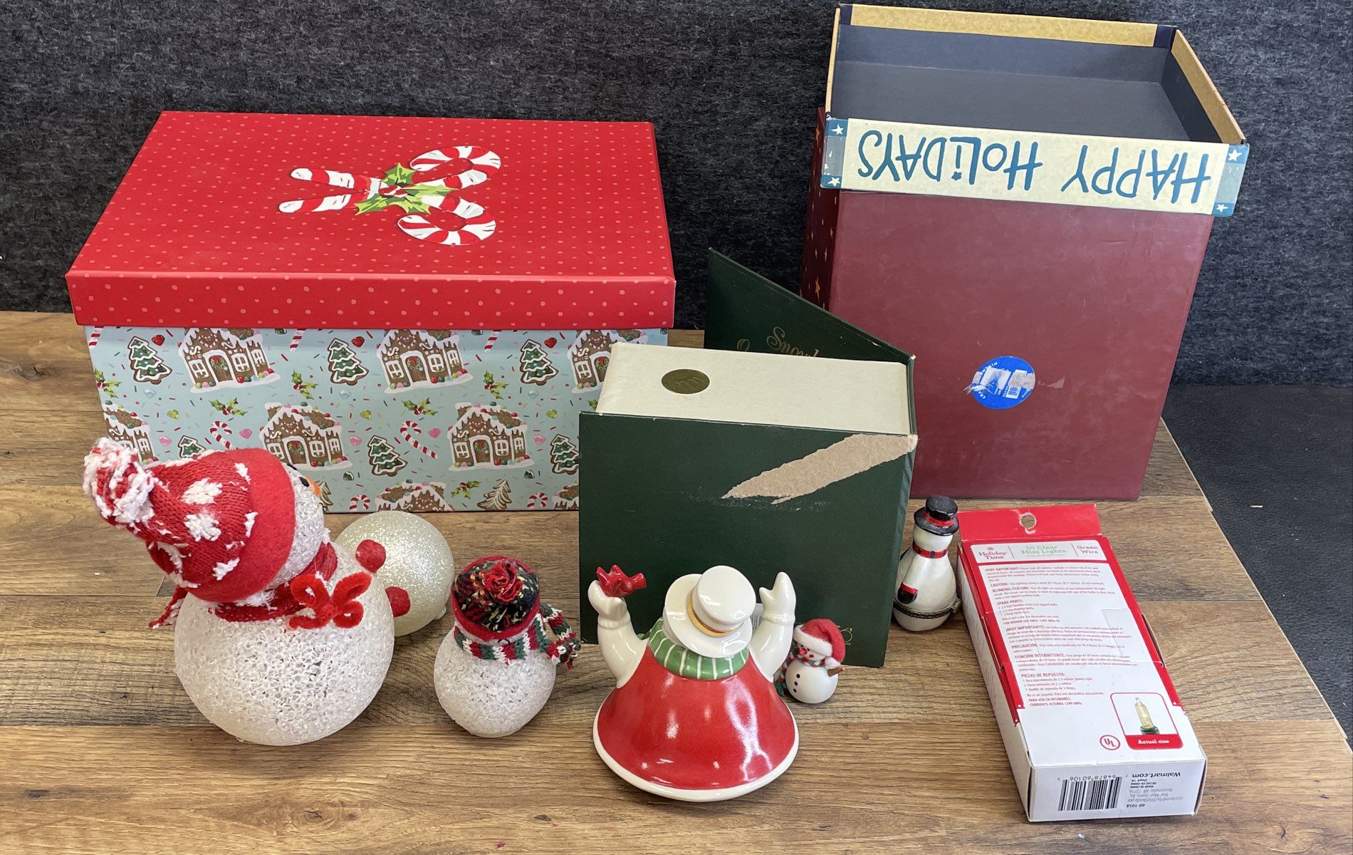 This festive lot includes a charming collection of snowman-themed Christmas and holiday decorations. It features a collectible Department 56 Snowbabies piece, an Earthshine snowman candle set, and several other delightful figurines. Perfect for starting or expanding a holiday display, this bundle offers a wonderful variety of cheerful decor.