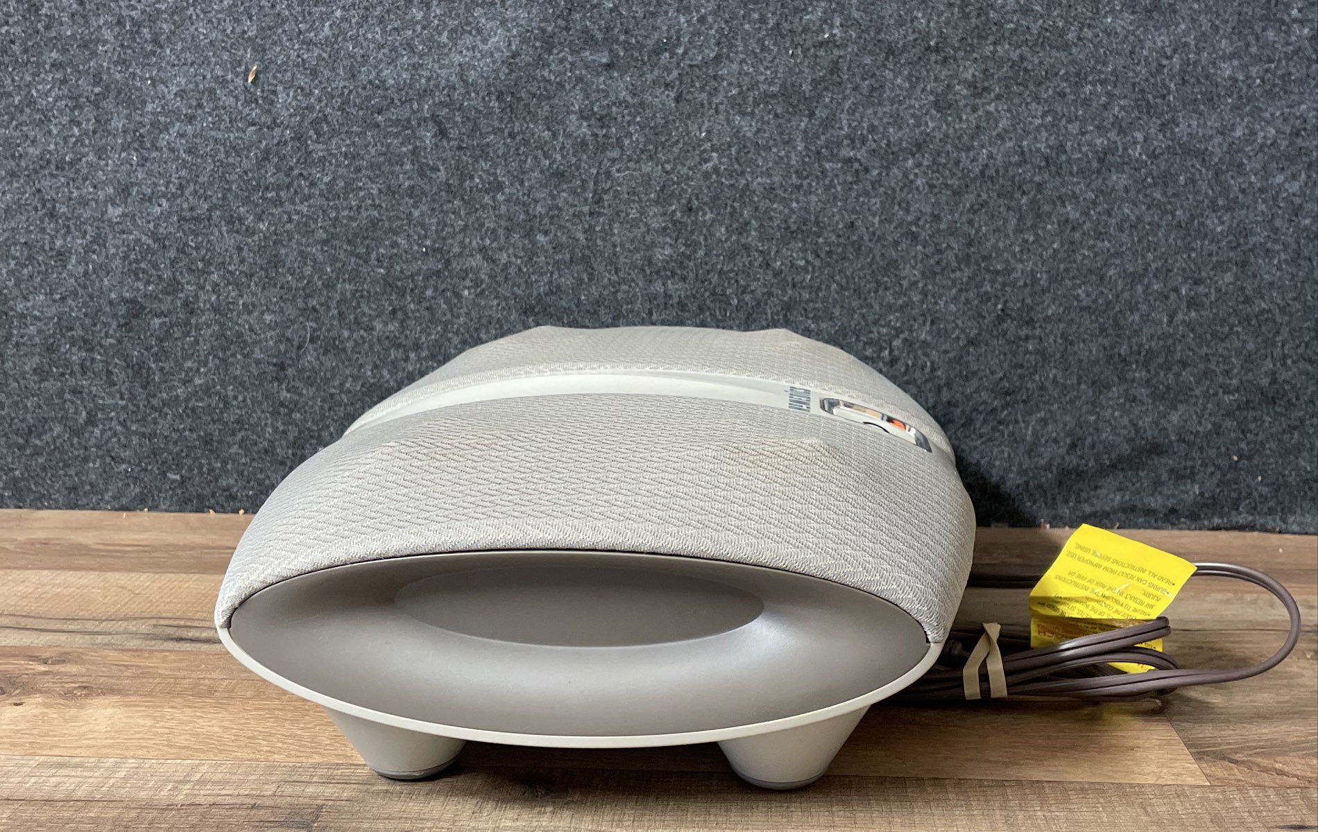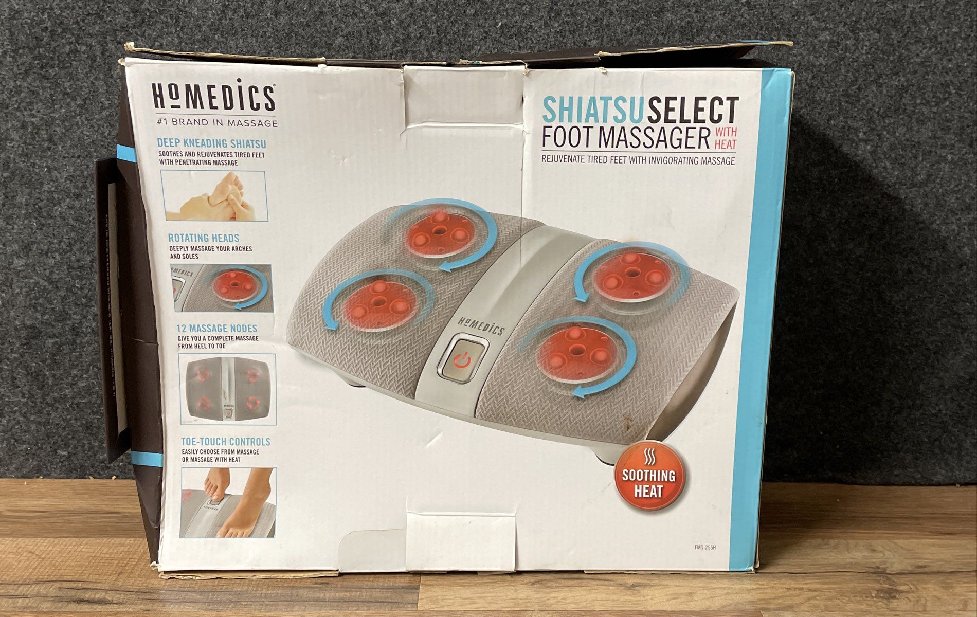 This is the HoMedics Shiatsu Select foot massager, designed to provide a deep kneading massage for tired arches and soles. It utilizes rotating heads with a total of twelve massage nodes to deliver a thorough massage from heel to toe. This model also includes an optional soothing heat function that can be activated to enhance relaxation. The controls are conveniently placed for easy toe-touch operation, eliminating the need to bend down.