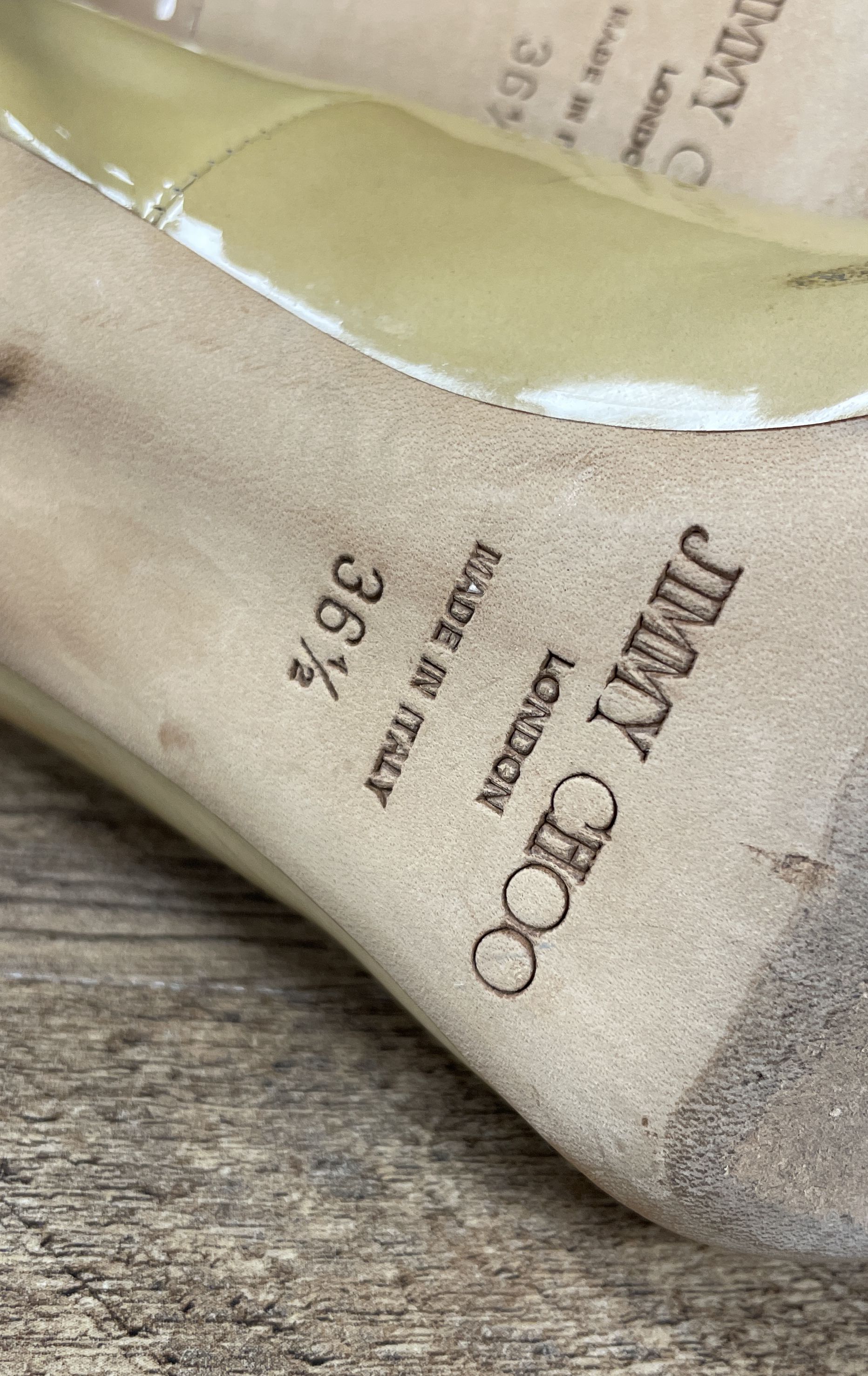 Condition: Good pre-owned condition with noticeable signs of wear. The patent leather uppers have various scuffs, stains, and marks, with wear concentrated at the toe points. The leather outsoles show significant scuffing from use. Insoles show light wear and one has a small tear in the lining as pictured.