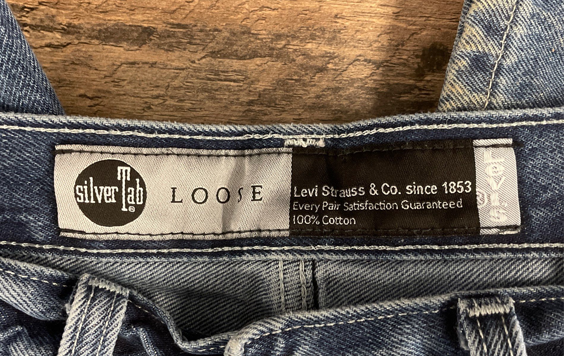 A pair of men's Loose Fit jeans from Levi's SilverTab, a modern reissue of the popular 90s style. Crafted from 100% cotton denim in a medium blue wash with factory fading and whiskering for a worn-in aesthetic. These jeans feature a classic five-pocket design, a zip fly with a button closure, and the signature SilverTab branding on the back patch, pocket tab, and hardware. The Loose Fit offers a relaxed feel through the seat and thigh with a straight leg opening.