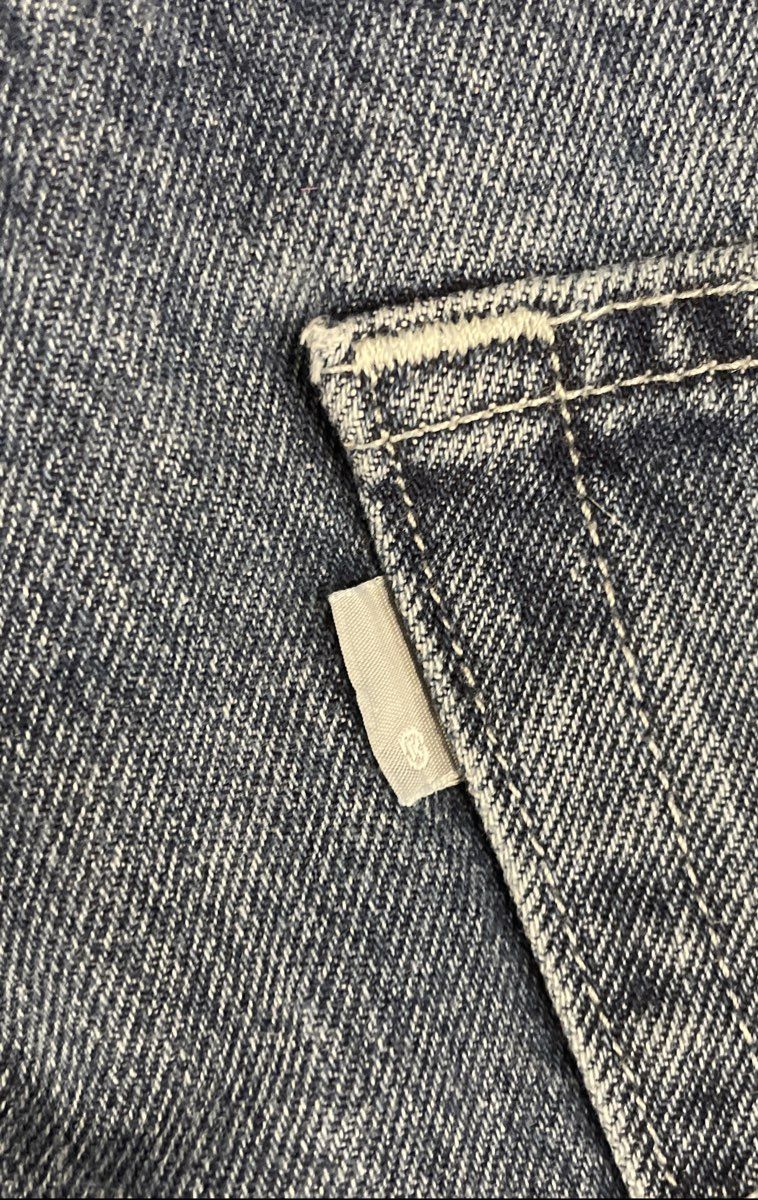 Condition: Good pre-owned condition. Shows general signs of wear including even fading throughout and light fraying at the leg opening hems. There is a spot of more noticeable discoloration on the back of the left leg as shown in photos. The back patch is creased from washing.