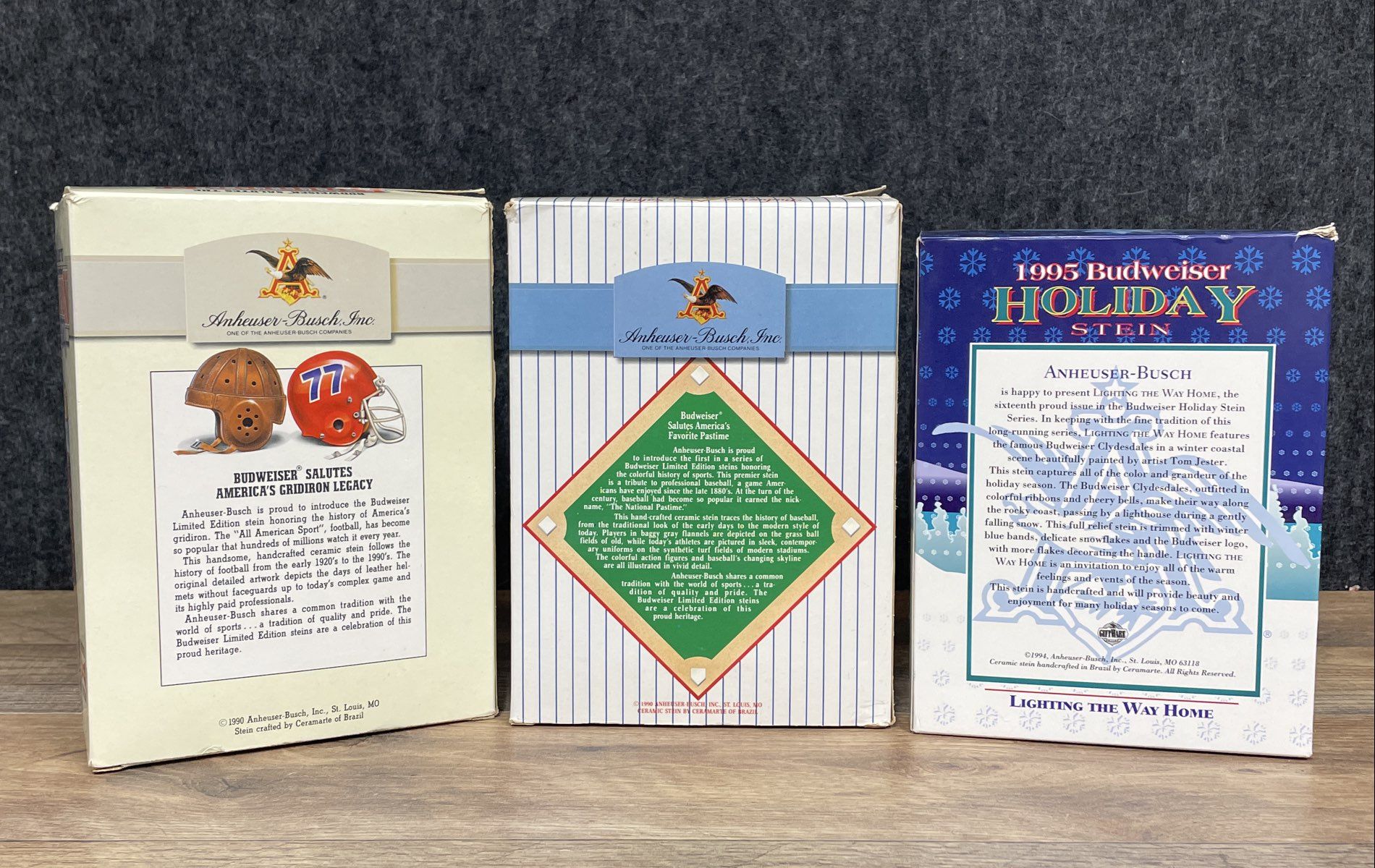 Lot of 3 Vintage Budweiser Steins Holiday 1995 Football Baseball w/ Boxes