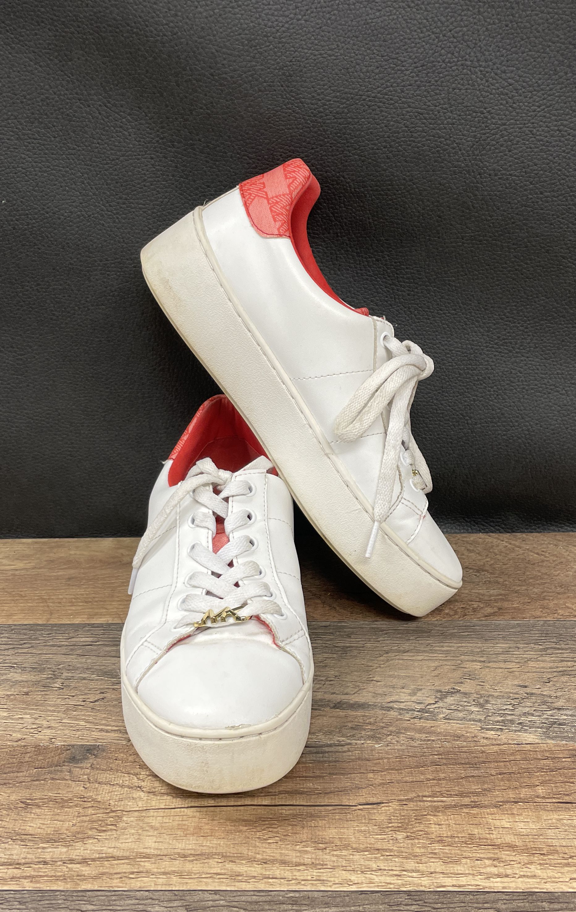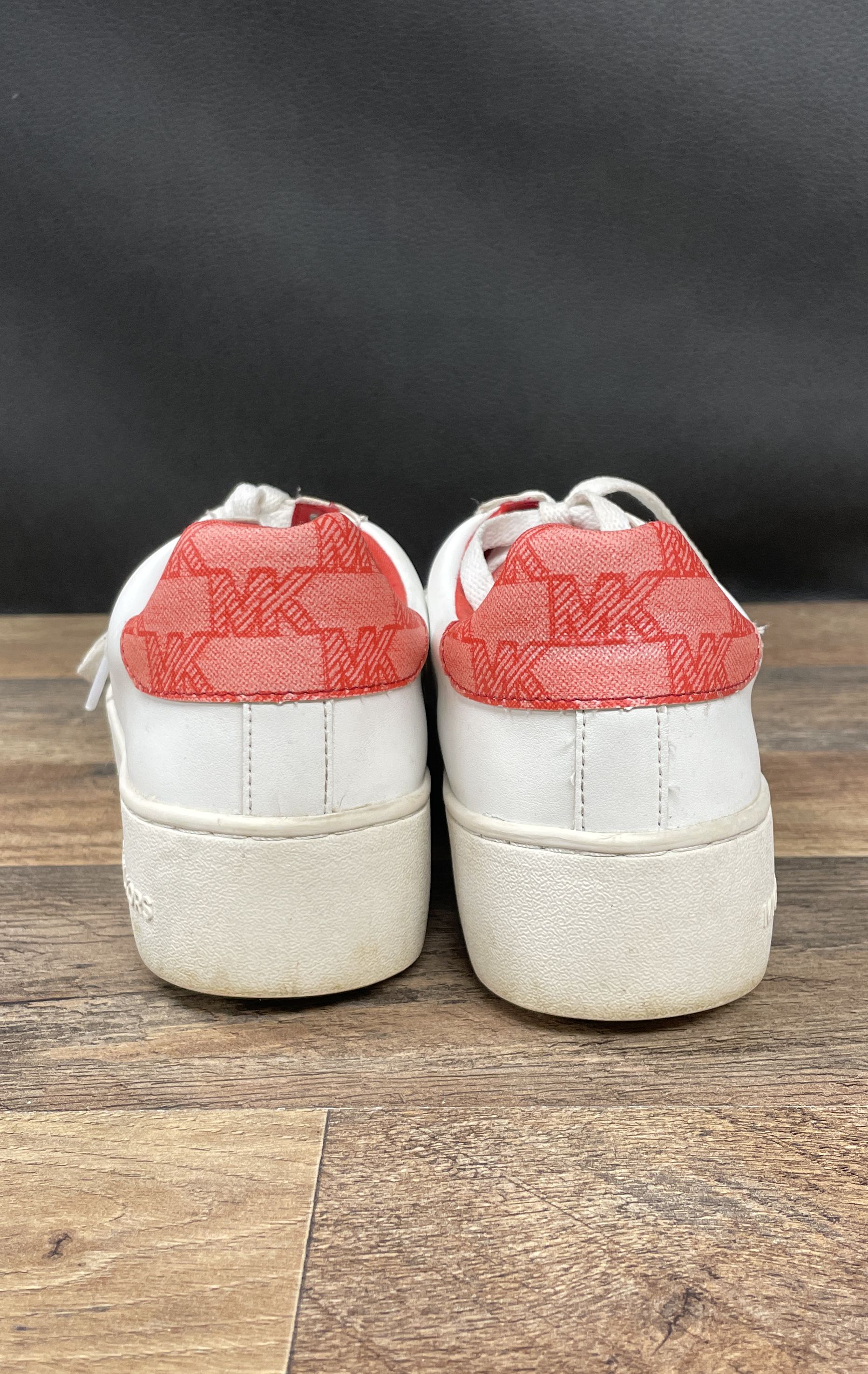 Michael Kors Irving Lace Up White Red Monogram Logo Platform Sneakers Size 7.5