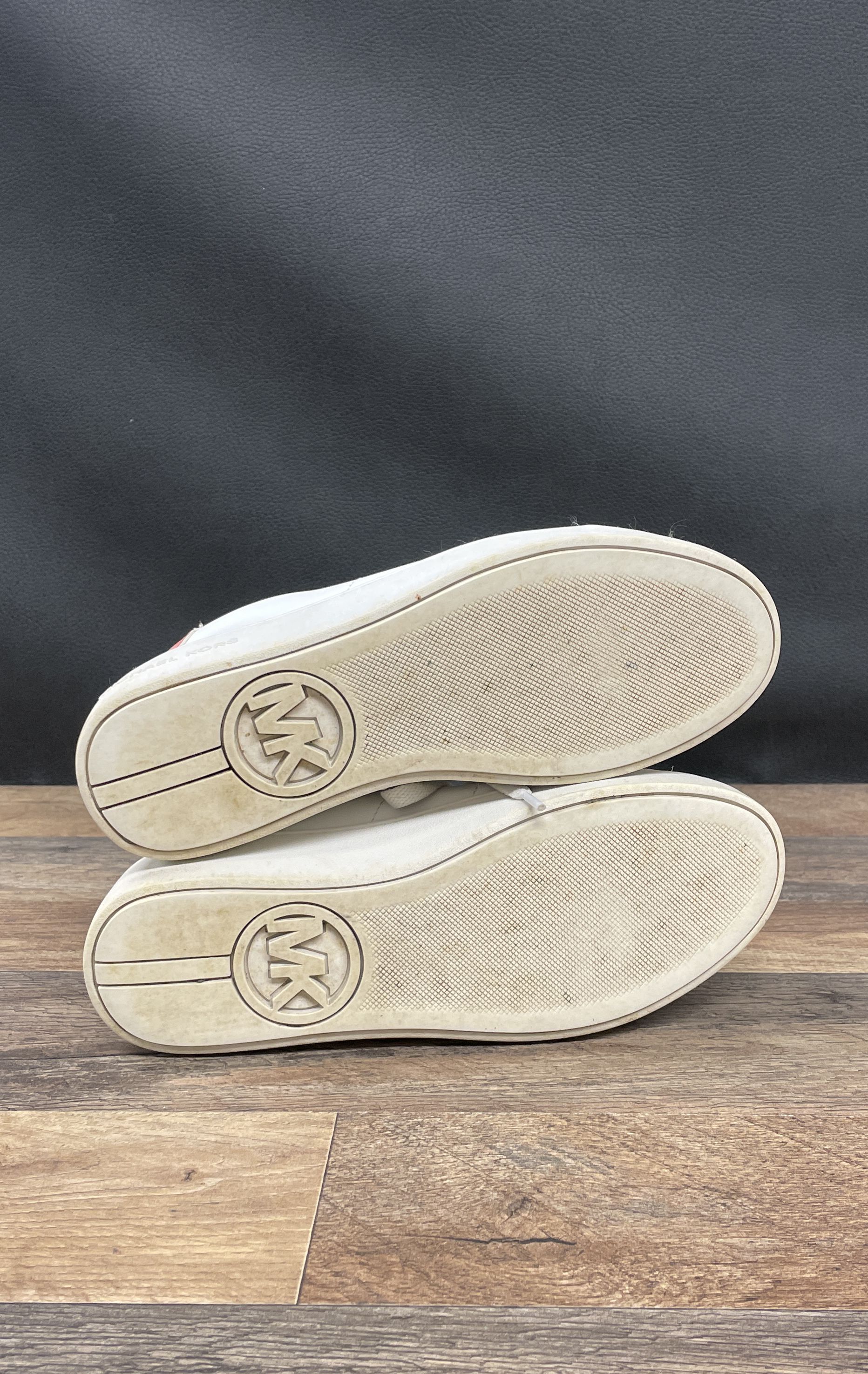 • Contrasting red heel tab features a repeating MK monogram print.