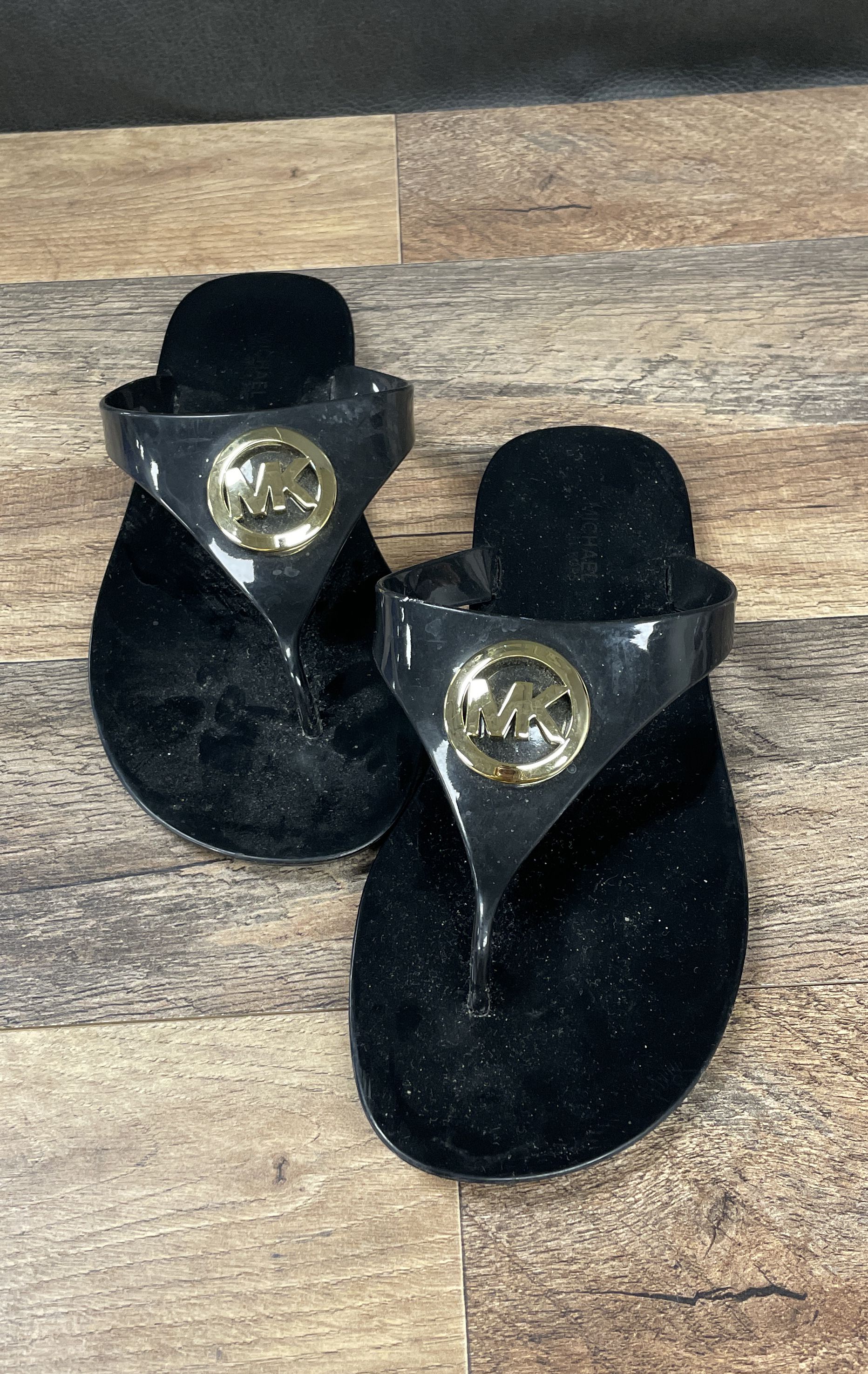 Michael Kors MK Plate Jelly Thong Sandals Black Gold Flip Flop Women's Size 7.5