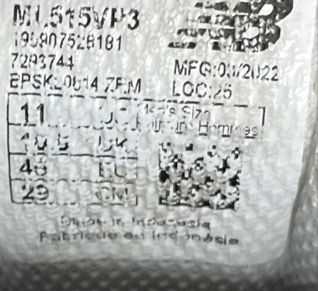 • Style Code: ML515VP3, Manufacture Date: 03/2022