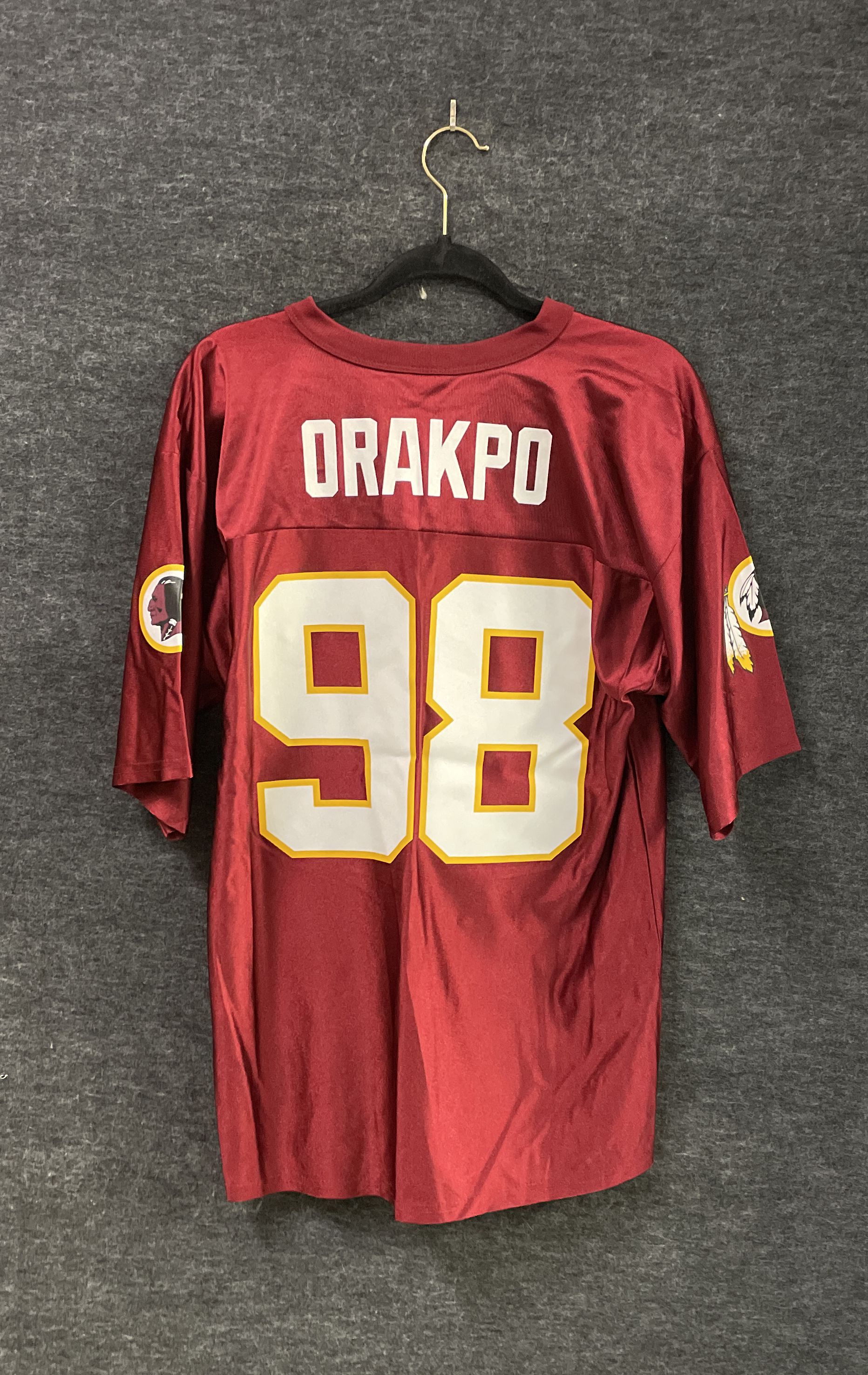 An officially licensed NFL Team Apparel jersey for the Washington Redskins, celebrating linebacker Brian Orakpo. This long-sleeve jersey features screen-printed name and #98 graphics on a durable polyester fabric. The design includes the classic Redskins logo on both sleeves, representing the era when Orakpo played for the team (2009-2014).