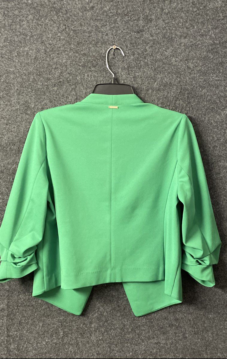 A contemporary open-front blazer from Nine West in a vibrant green hue. This piece features a modern cropped silhouette and stylish 3/4 length ruched sleeves, making it a versatile layering item for both professional and casual outfits. The jacket is unlined for a lightweight feel.