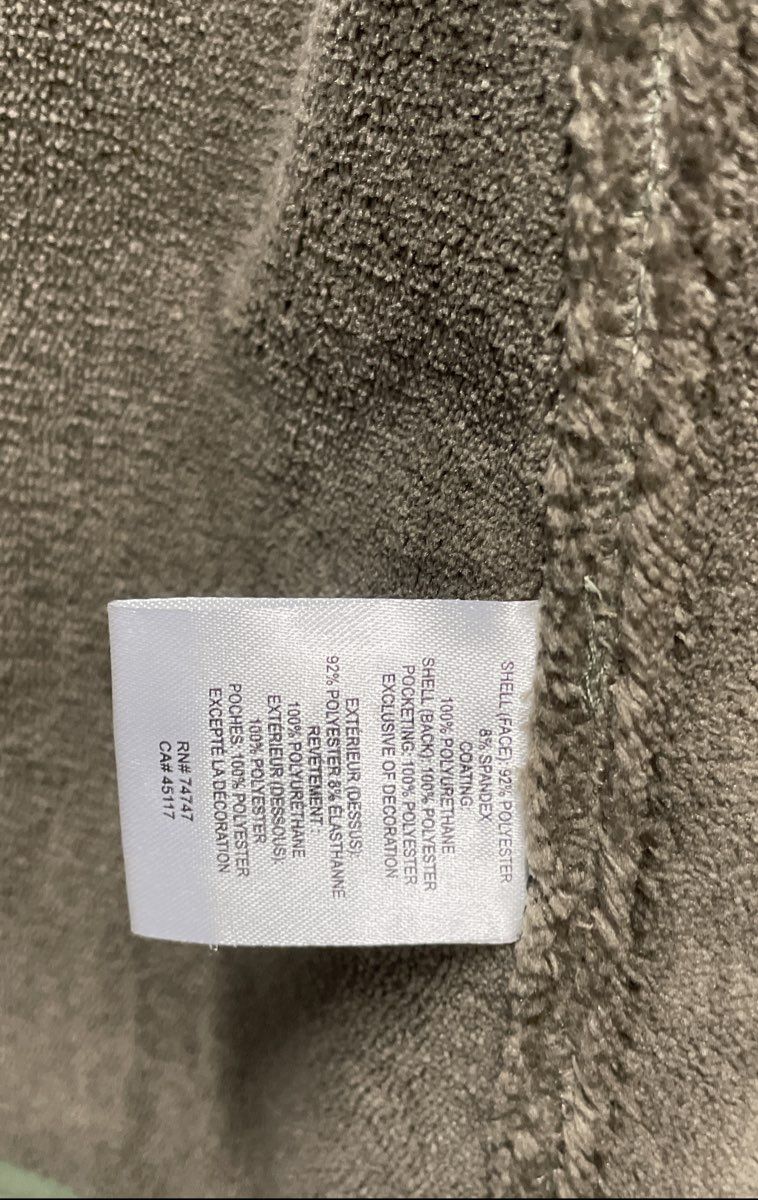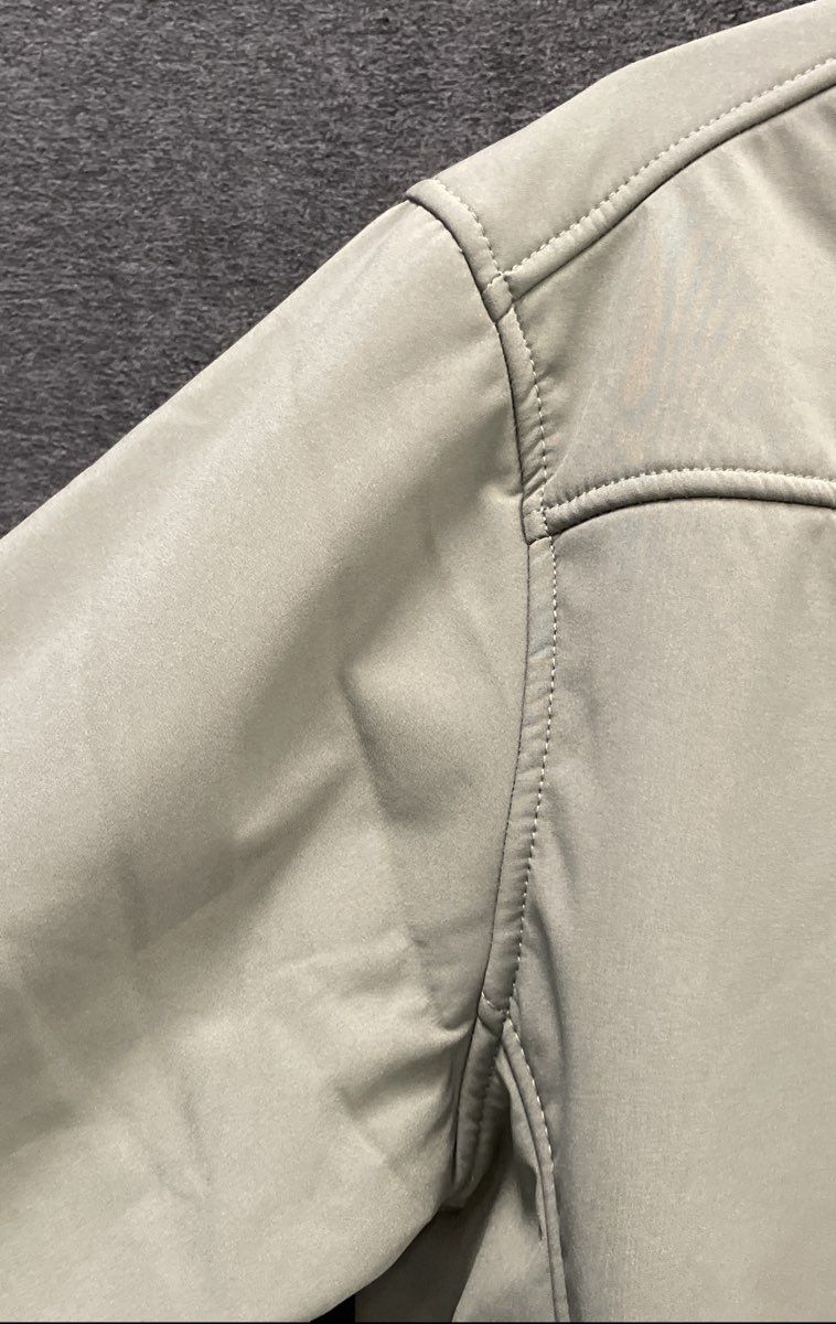 A new with tags men's full zip jacket from Red Head Brand Co. This jacket is constructed with a durable softshell exterior in a sage green color, designed for outdoor and workwear activities. The interior is fully lined with a soft, warm fleece for comfort in cooler weather. It features a full-zip front closure that extends to a mock neck collar for added protection.