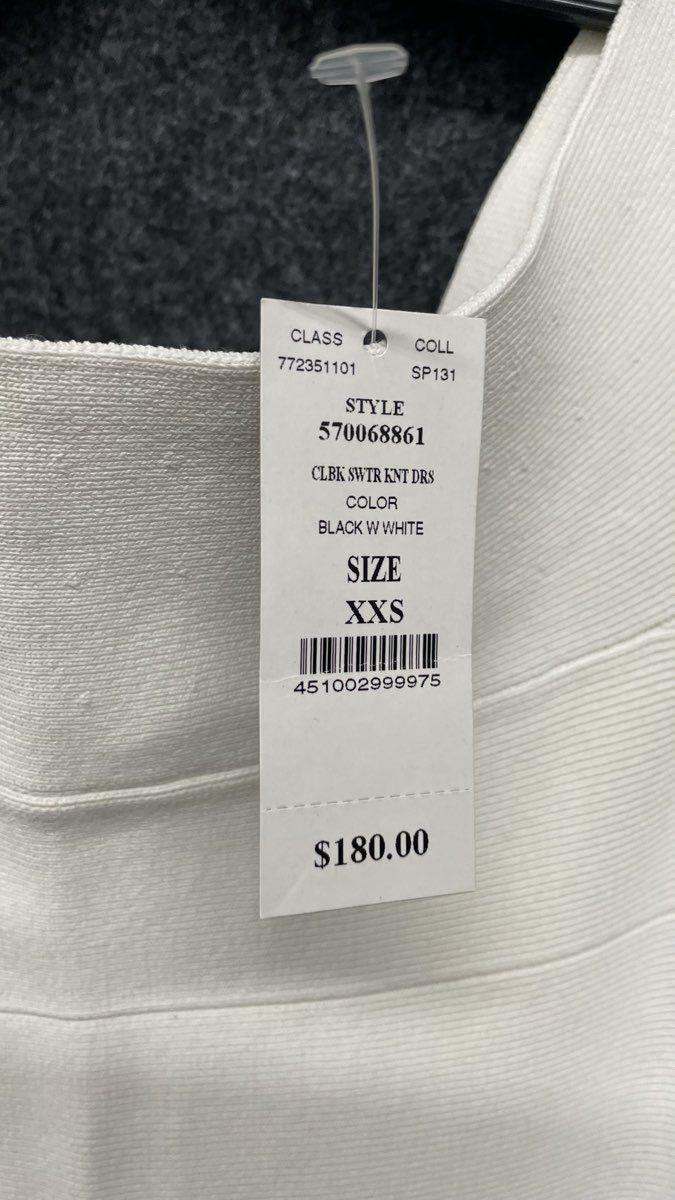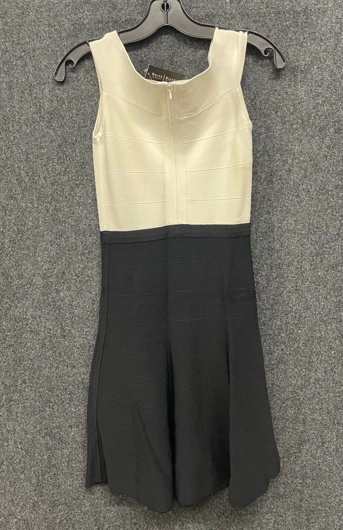 A new with tags sleeveless sweater dress from White House Black Market. This piece features a modern colorblock design with an ivory bodice and a black skirt. Crafted from a substantial, stretchy ribbed knit fabric, it offers a flattering fit-and-flare silhouette. The dress has a scoop neckline and a center back zipper closure, making it a versatile choice for various occasions.