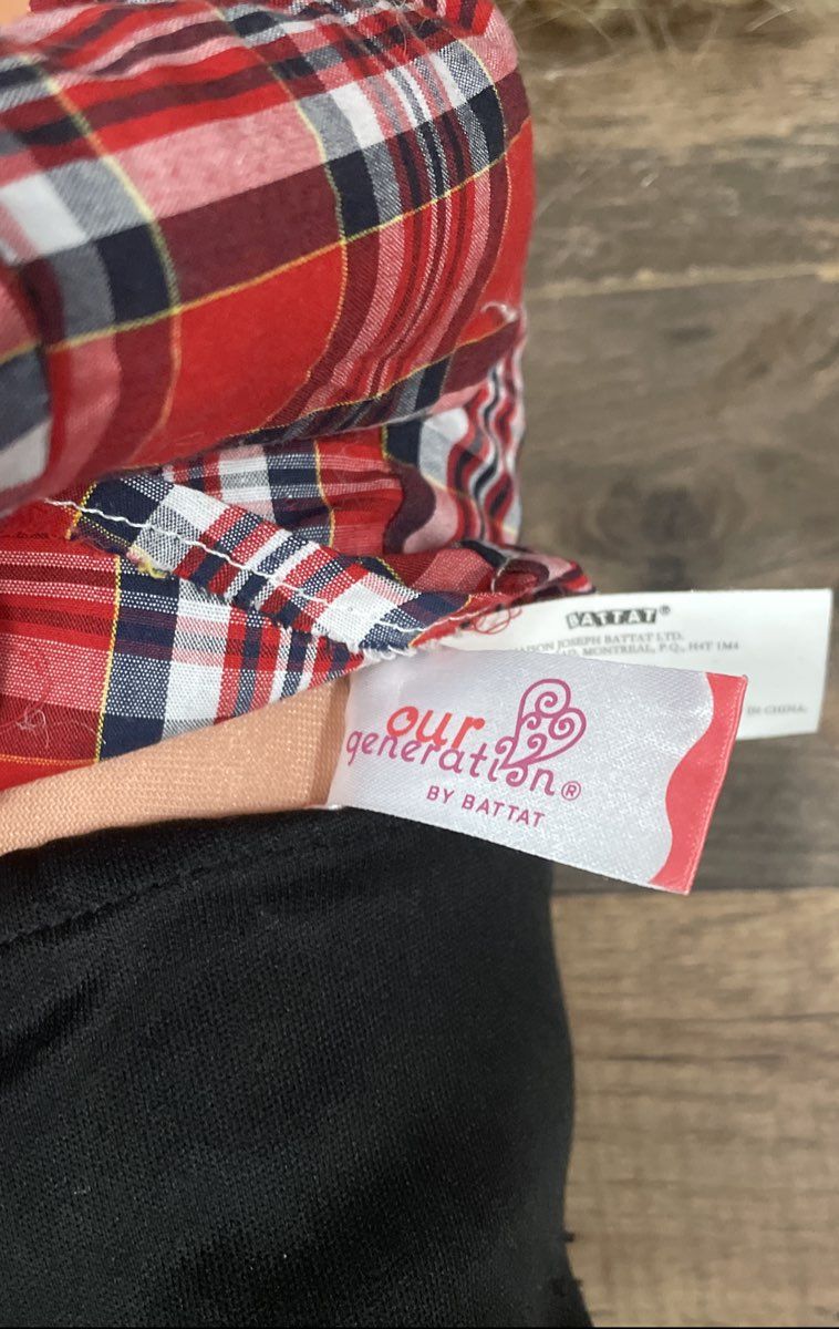 1. Our Generation Doll with straight blonde hair, dressed in a red plaid shirt, black pants, and black shoes.