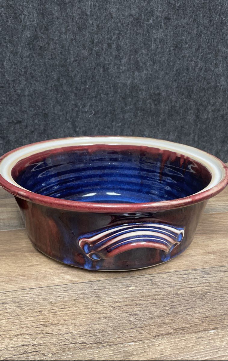 • The studio pottery casserole has a ribbed form with a striking cobalt blue interior glaze.