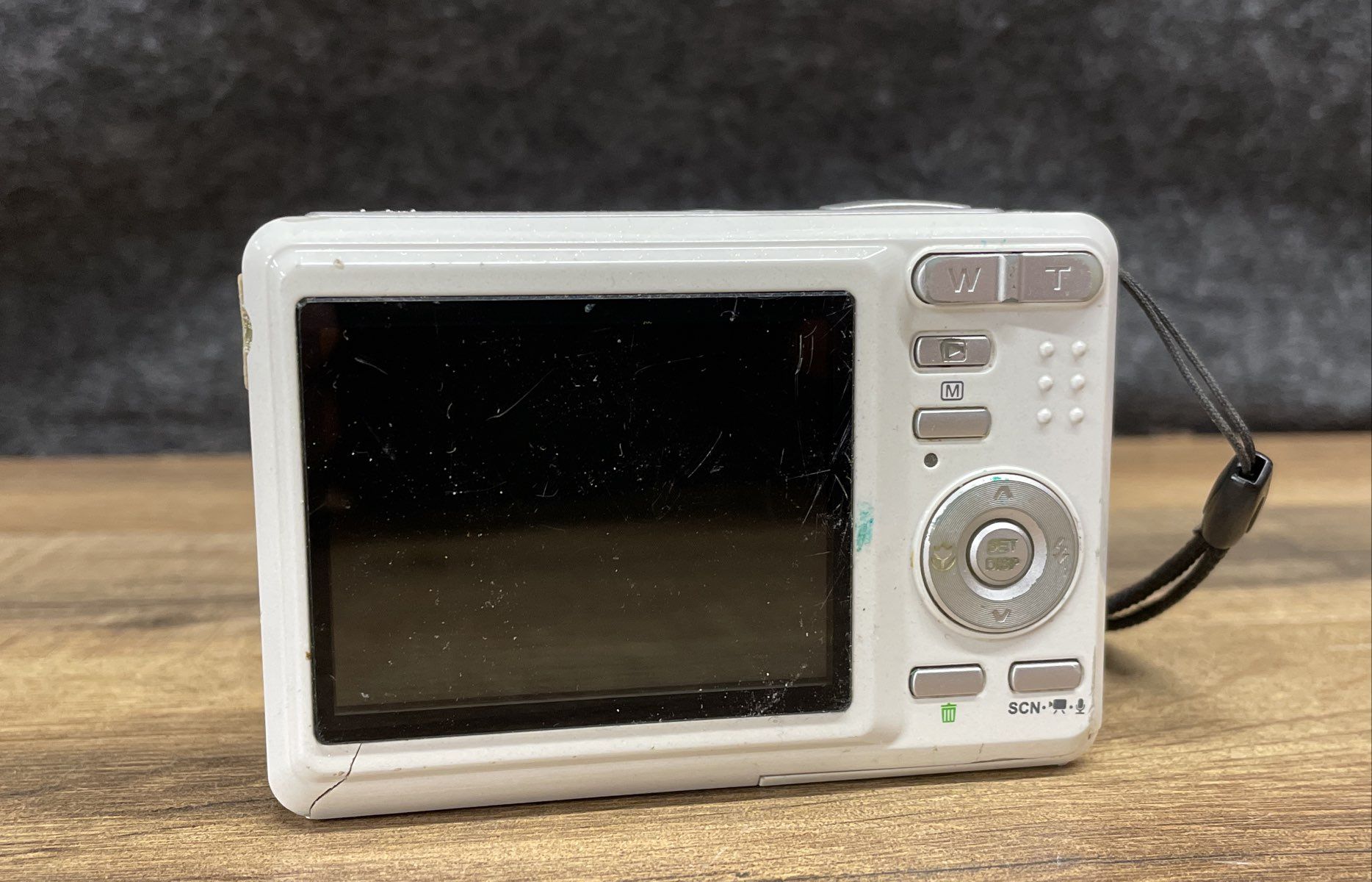 Condition: Used cosmetic condition. The camera body shows noticeable wear, including scuffs, scratches, and a small crack in the plastic housing on the back panel. The LCD screen is heavily scratched. The lens appears to be clear. Please review all photos for a detailed assessment of the item's condition. Functionality is untested.