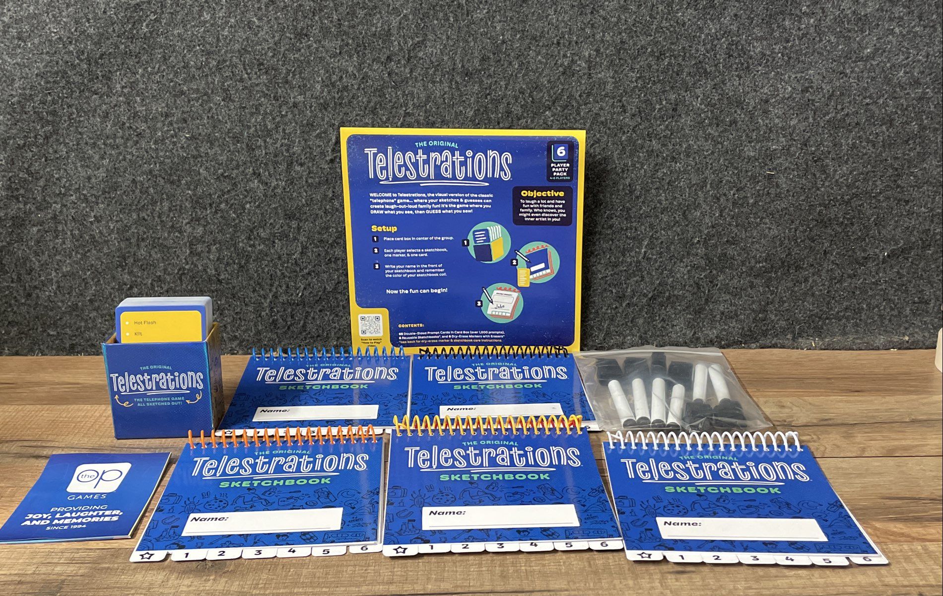 This is a listing for The Original Telestrations party game by The OP Games. Known as "The Telephone Game All Sketched Out," this game is a modern classic for parties and family game nights, celebrated for creating hilarious and unpredictable outcomes. The goal is to draw what you see, then guess what you saw, revealing how communication can break down with funny results.