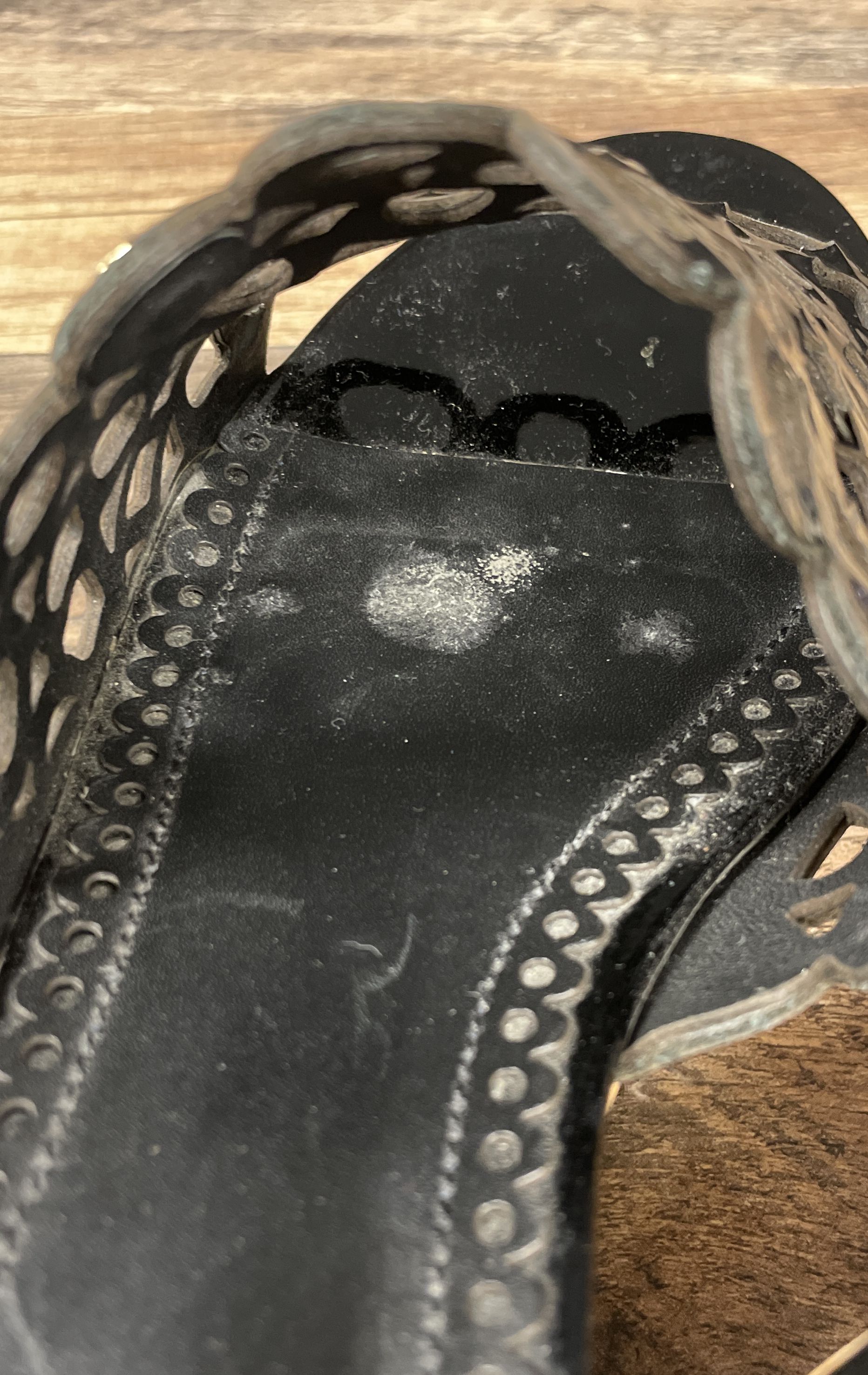 • Black patent leather upper with detailed laser-cut design