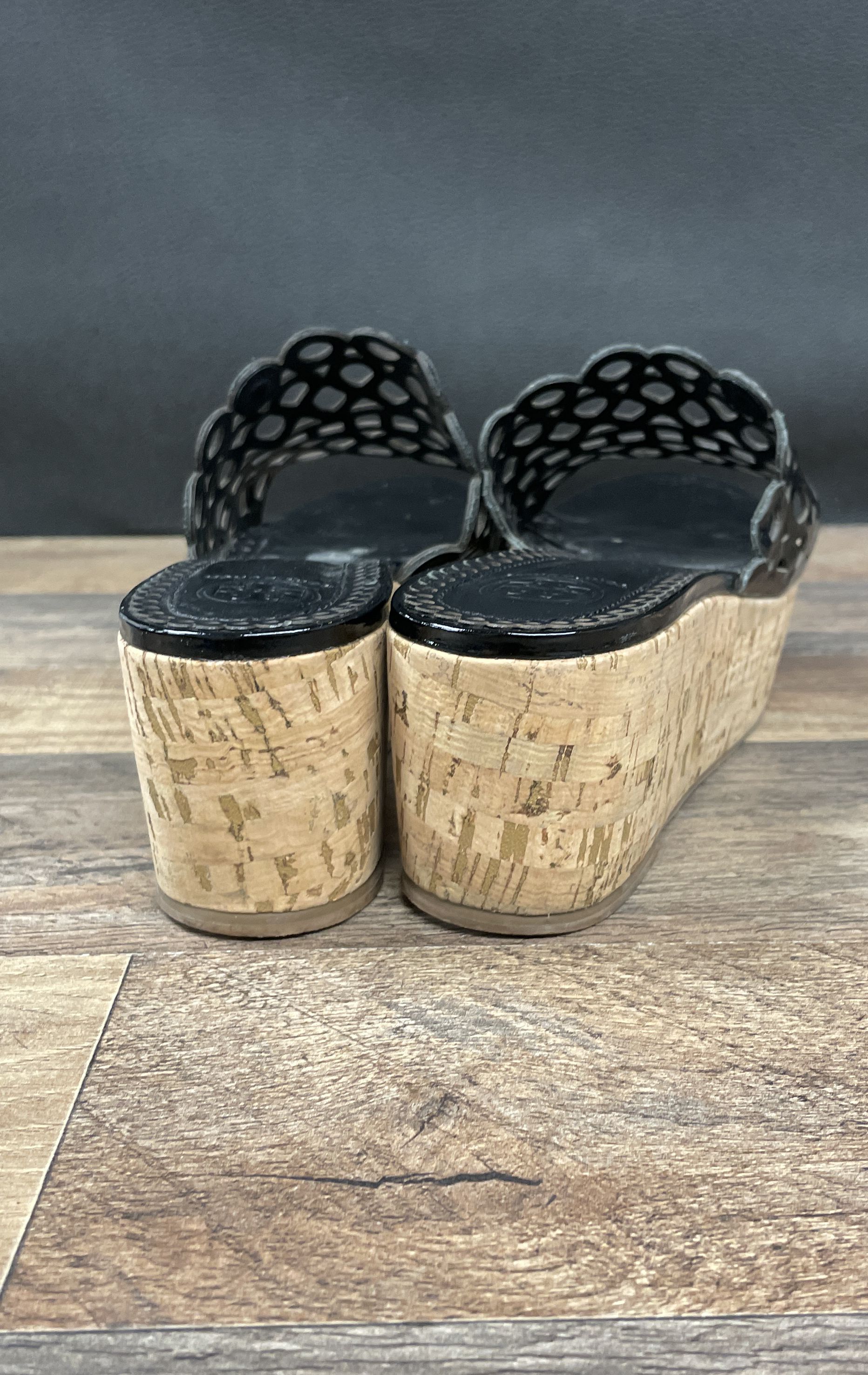 Tory Burch Chandler Black Patent Laser Cut Wedge Slide Sandal Size 7.5