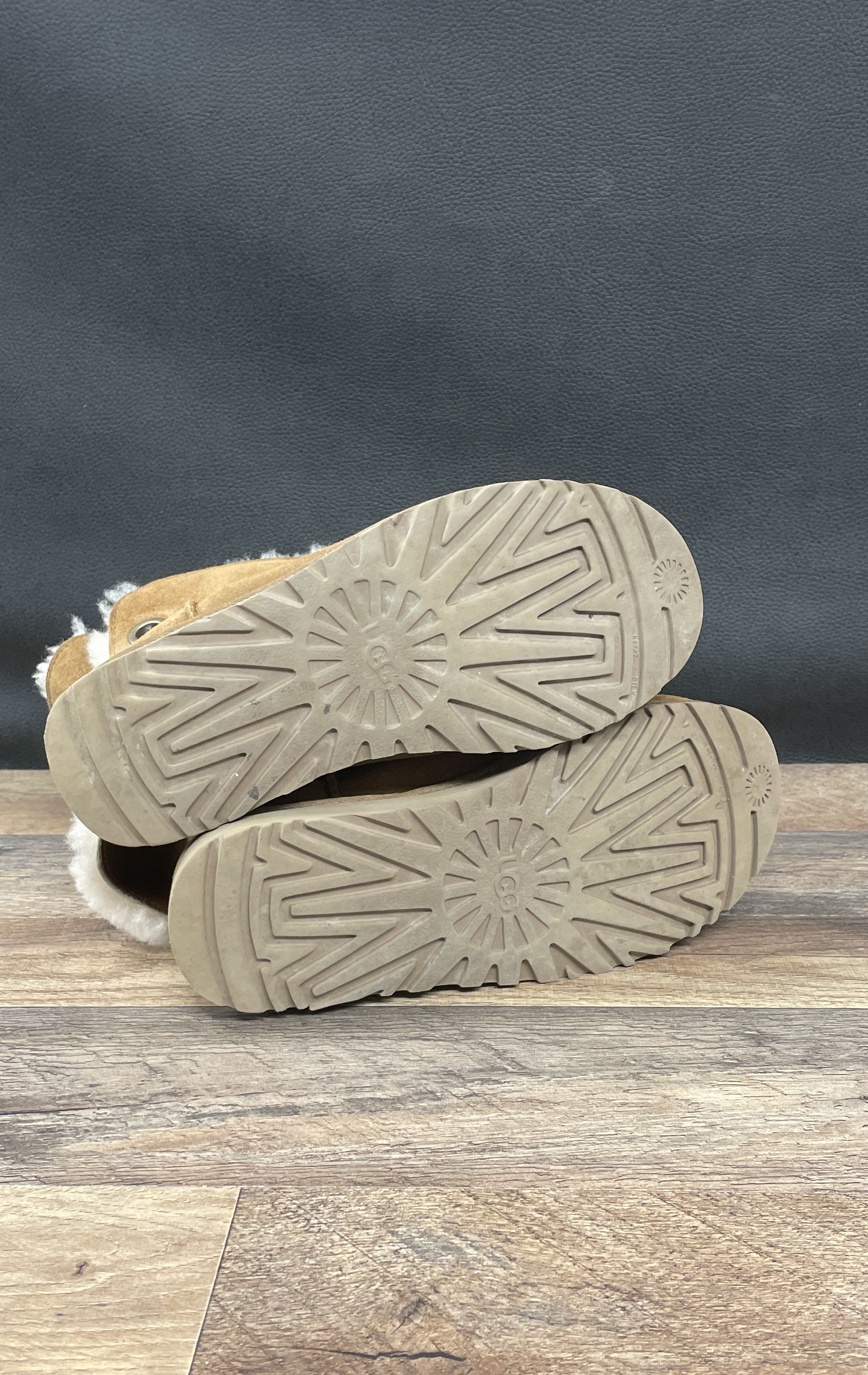 Condition: Good pre-owned condition. The suede uppers show light, even wear and minor scuffing with no significant stains or damage. Outsoles have minimal tread wear and light heel drag. The interior shearling lining remains plush and clean.