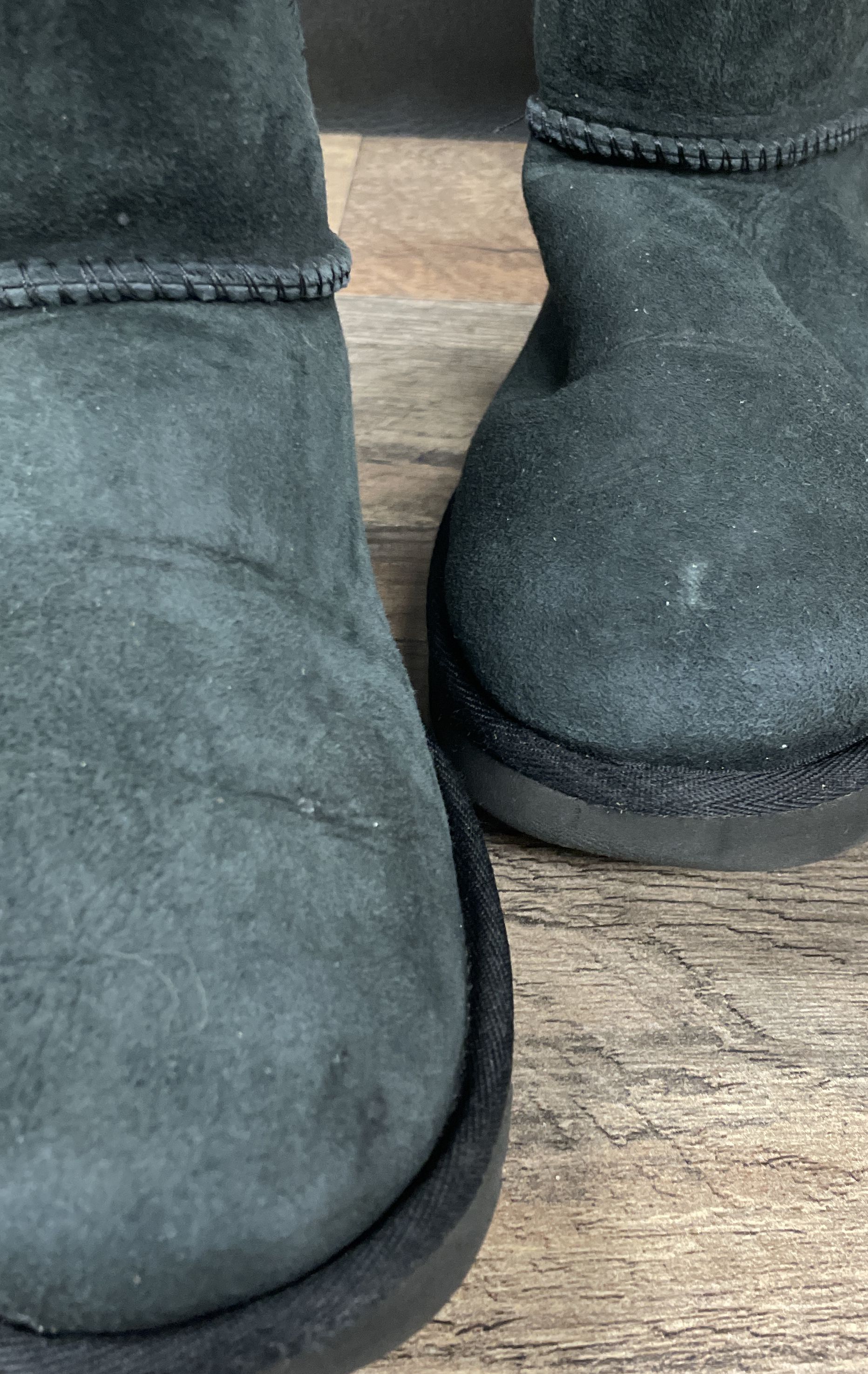 Condition: Very Good pre-owned condition. The suede uppers show some light, even wear and minor scuffing consistent with gentle use. The interior shearling is clean and plush. Outsoles exhibit minimal wear with excellent tread life remaining.