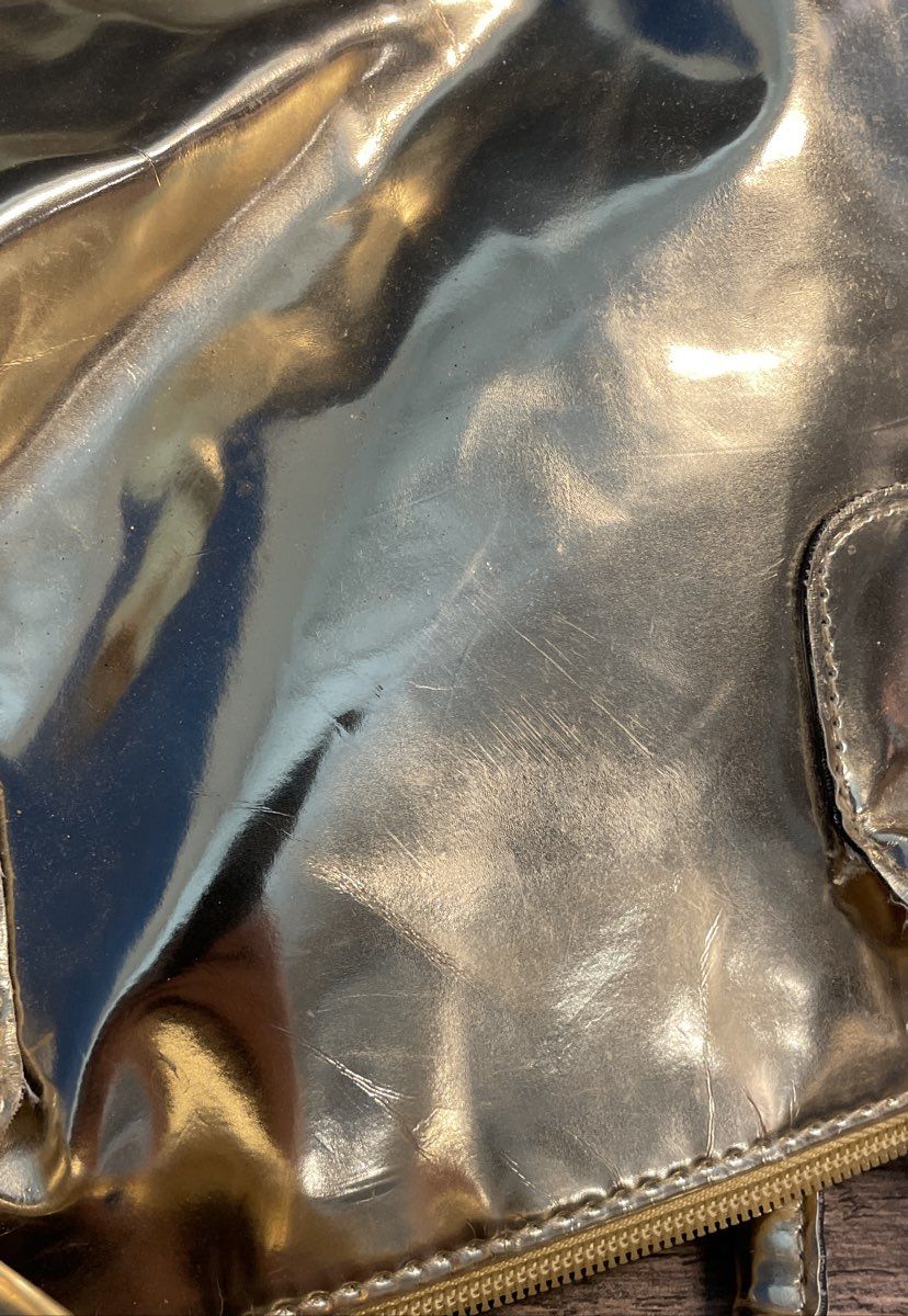 Condition: Pre-owned condition with visible signs of wear. The metallic exterior shows significant surface scratching and scuffing throughout. The top handles exhibit noticeable peeling and material loss. The interior lining shows some staining and general wear consistent with previous use.
