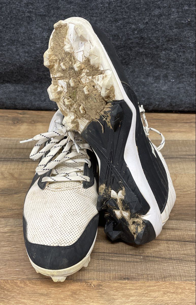 Condition: Good pre-owned condition. The cleats show moderate wear consistent with use in games. Uppers have noticeable dirt, scuffs, and creasing. The outsoles and cleats have caked-on dirt and show wear on the tread. Insoles and interior lining show light wear. Please see photos for a detailed depiction of condition.