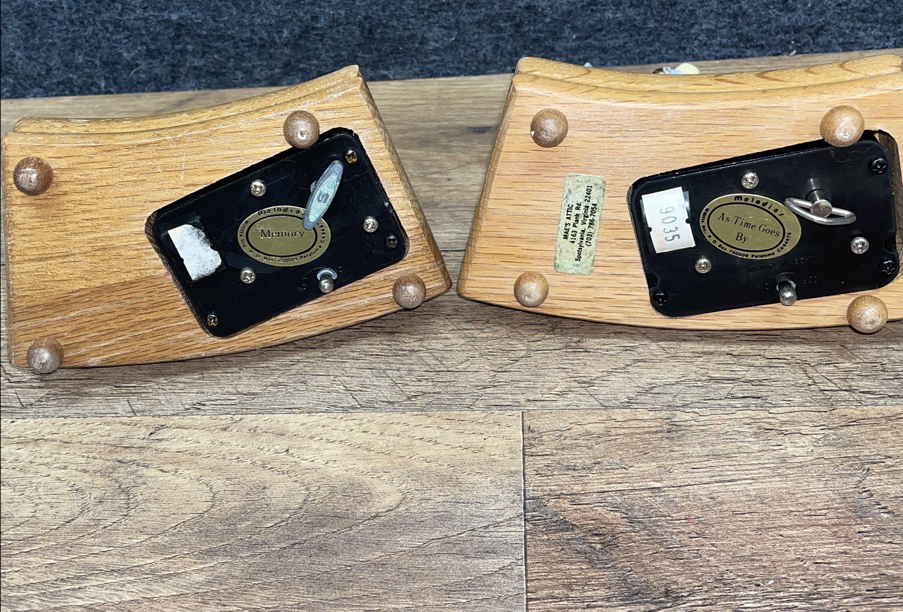 Condition: Good vintage condition. Both music boxes have been tested and are functional. The porcelain figures appear to be free of chips or cracks upon inspection. The wooden bases show some light to moderate surface scuffs, scratches, and edge wear consistent with age and use. Hardware shows some minor patina.