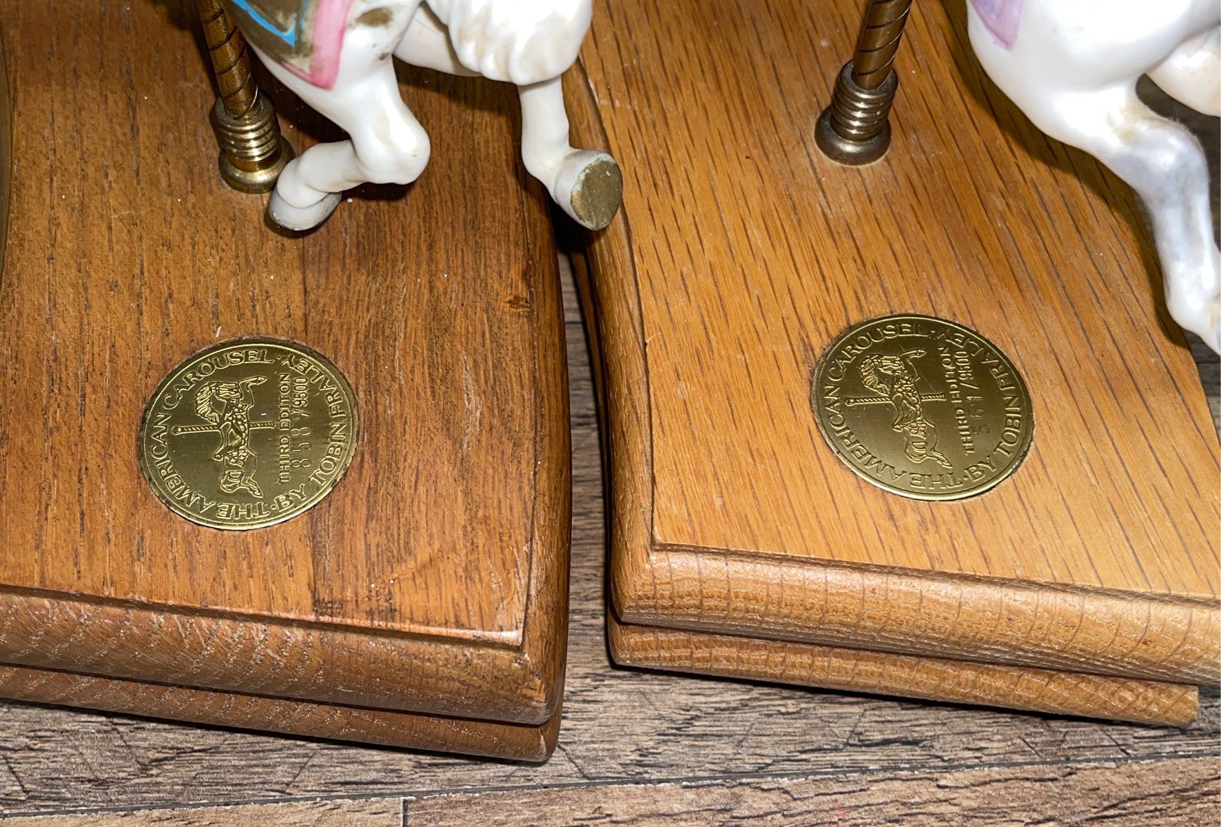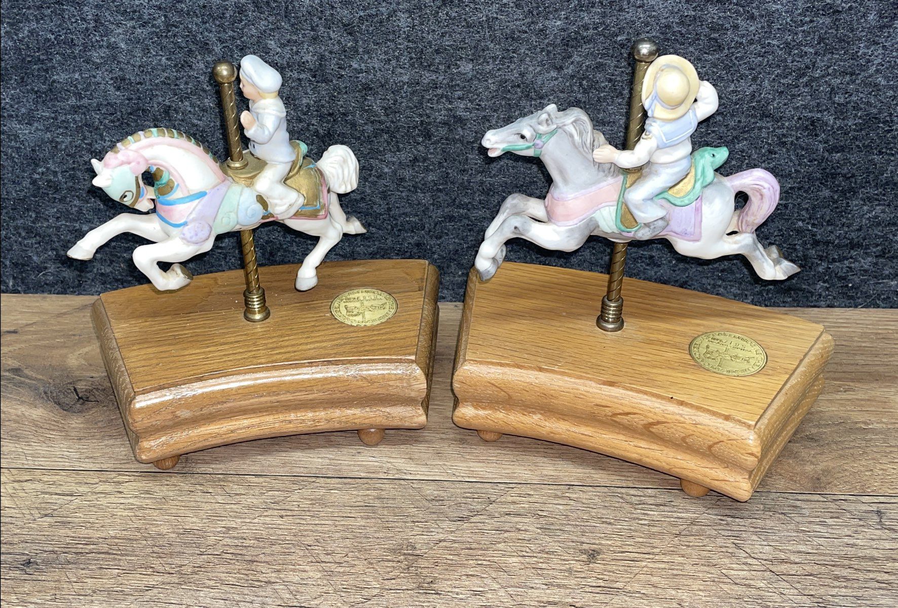 A charming vintage lot of two porcelain and wood music boxes from The American Carousel collection, dated 1985. Each piece features a detailed porcelain figure on a carousel horse, mounted with a brass pole to a curved wood base. The bases are fitted with wind-up music box mechanisms on the underside. This lot includes: