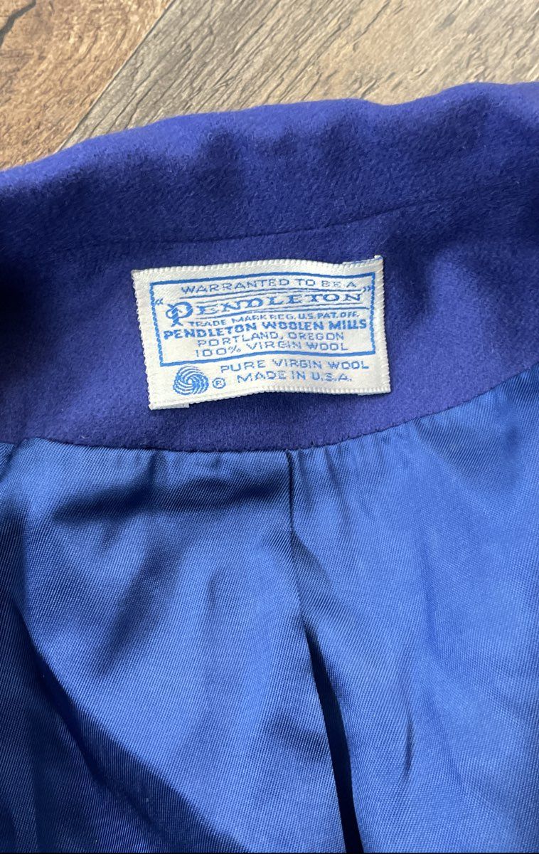 This vintage 1980s blazer from Pendleton is crafted from 100% pure virgin wool in a vibrant periwinkle purple. The jacket features a classic single-breasted design with a one-button closure and notched lapels. It is fully lined in a contrasting bright blue fabric for comfort and a pop of color. The structured shoulders and timeless cut make it a versatile piece of vintage American-made outerwear.