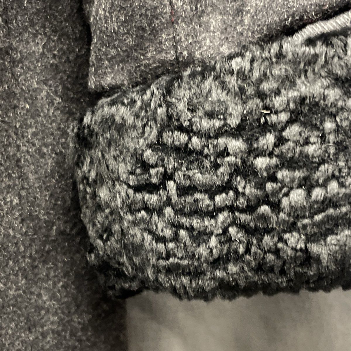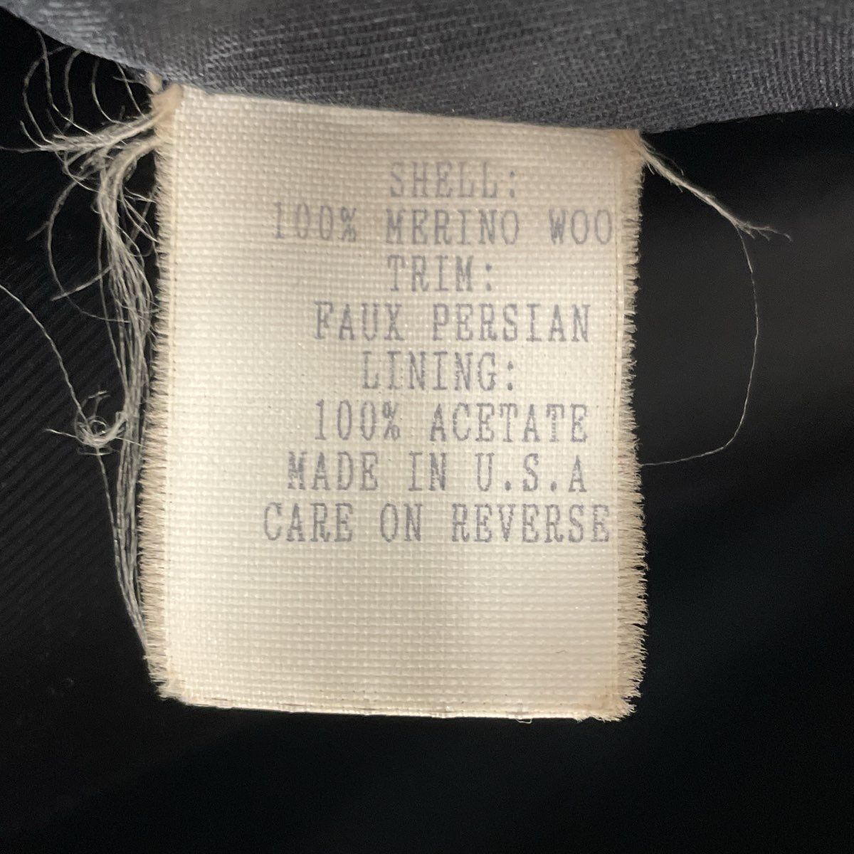 A classic vintage overcoat from New York designer John Caruana, crafted in the USA from 100% fine Merino Wool. This single-breasted long coat features a timeless silhouette in a deep charcoal black. The collar and fold-over cuffs are accented with a textured Faux Persian Lamb trim for an elegant touch. The interior is fully lined with smooth acetate for comfort and ease of wear.