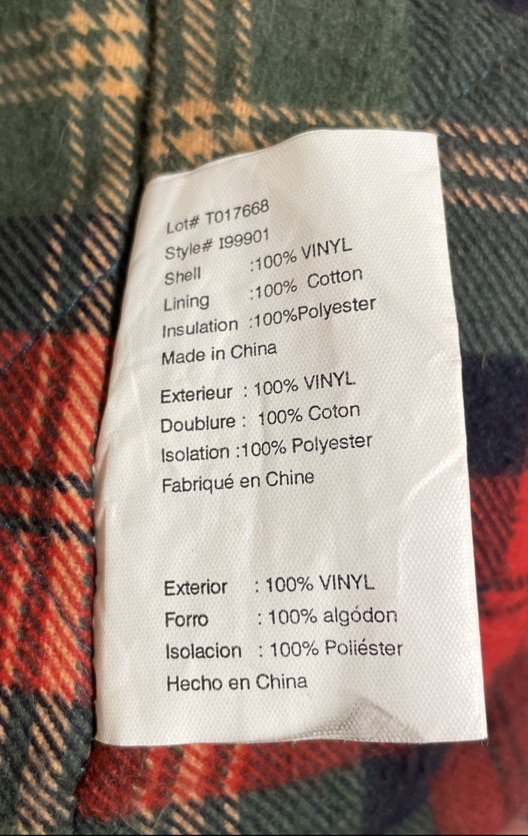 • Shell: 100% Vinyl; Lining: 100% Cotton; Insulation: 100% Polyester