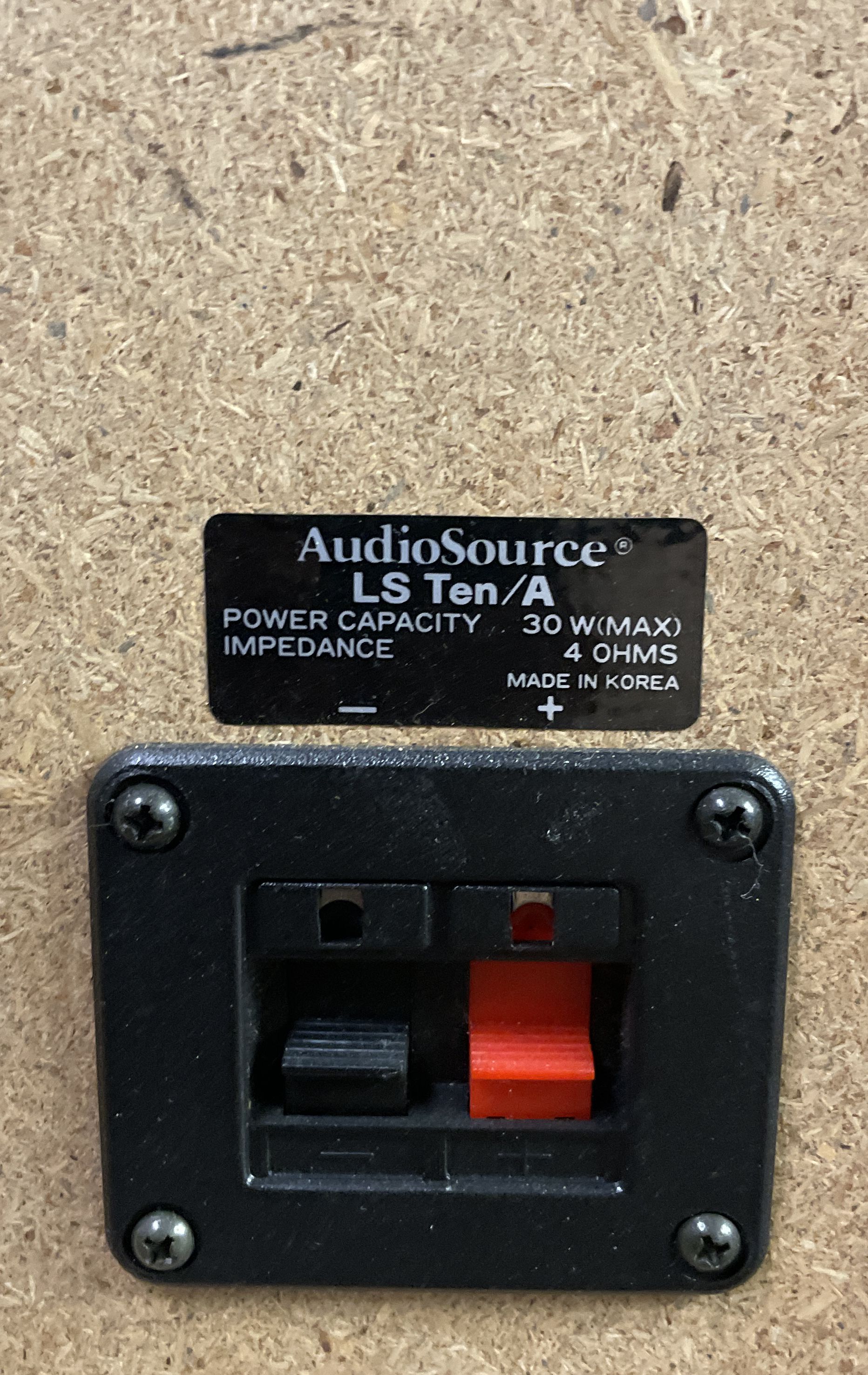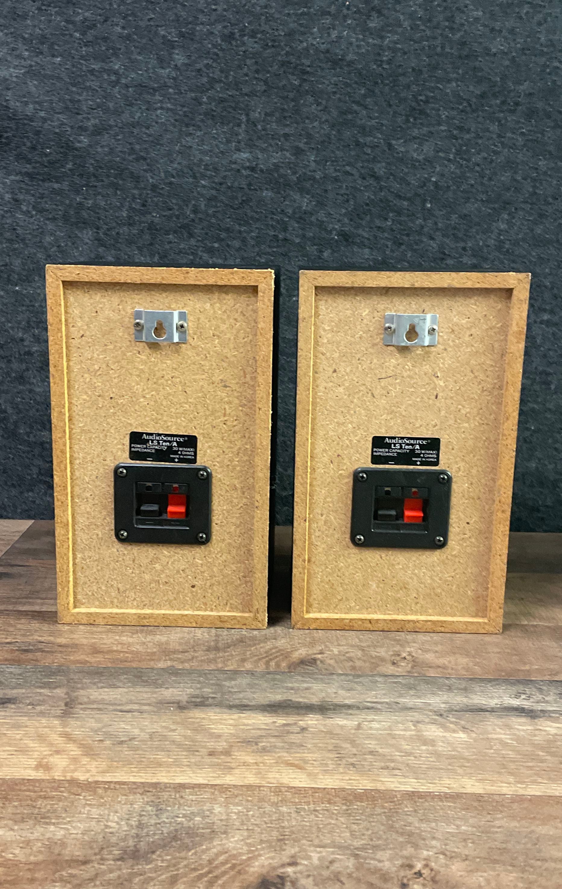 A compact pair of vintage AudioSource LS Ten/A 2-way bookshelf speakers. Manufactured in Korea, these speakers are well-suited for a small stereo setup, garage system, or as part of a retro audio collection. Their 4-ohm impedance and 30-watt maximum power handling make them compatible with a wide range of vintage and modern amplifiers.