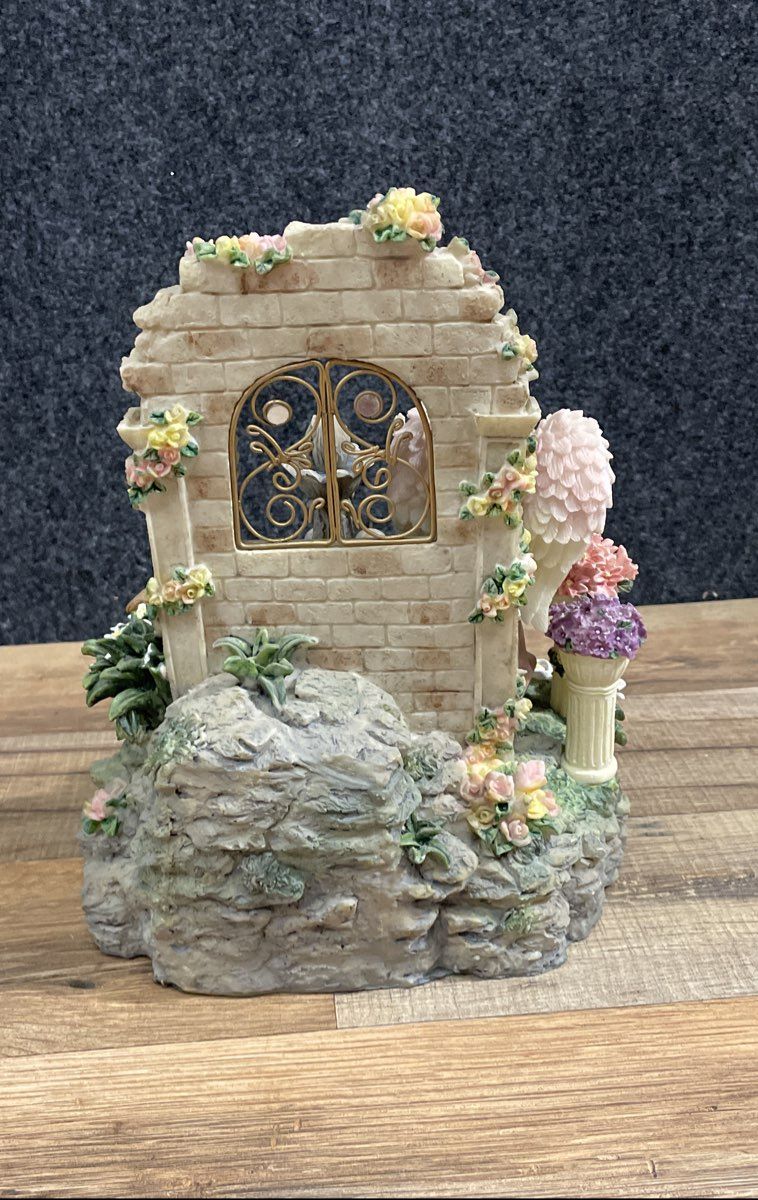 This charming vintage figurine from Classic Treasures depicts a serene scene of an angel with a lamb, a cherub, a lion, and a deer gathered around a two-tiered water fountain. The figures are set against a rustic stone archway adorned with colorful flowers and vines. According to the label, this piece is designed to play the song "Everything is Beautiful." It is a detailed and decorative collectible that evokes a sense of peace and harmony, reminiscent of the lion and the lamb biblical imagery.