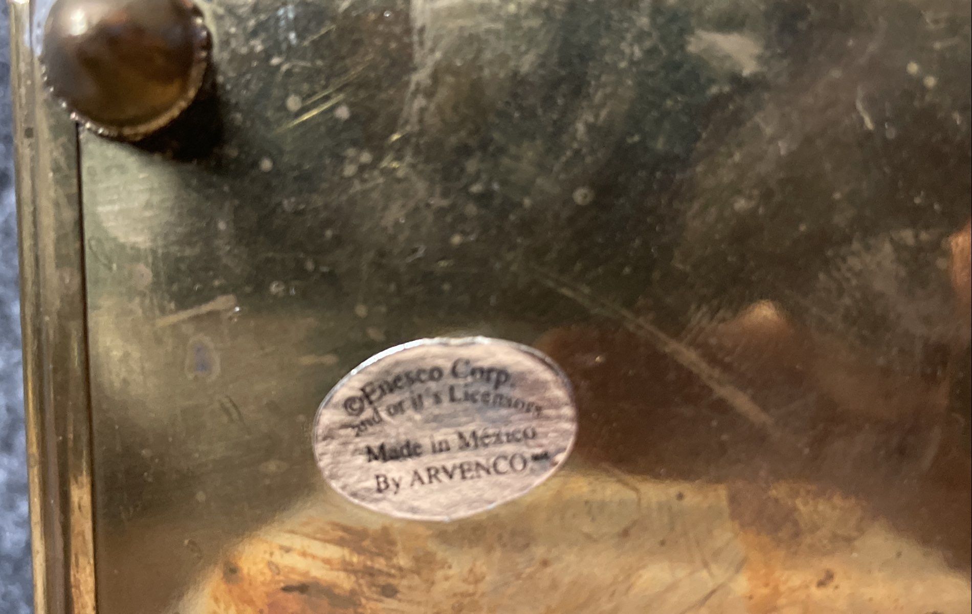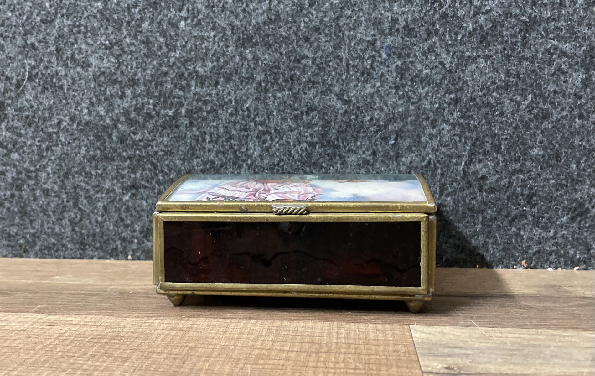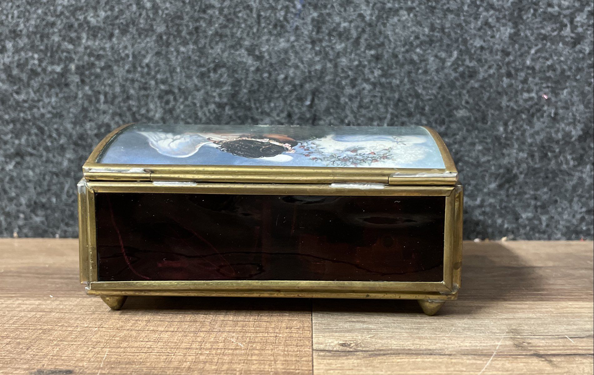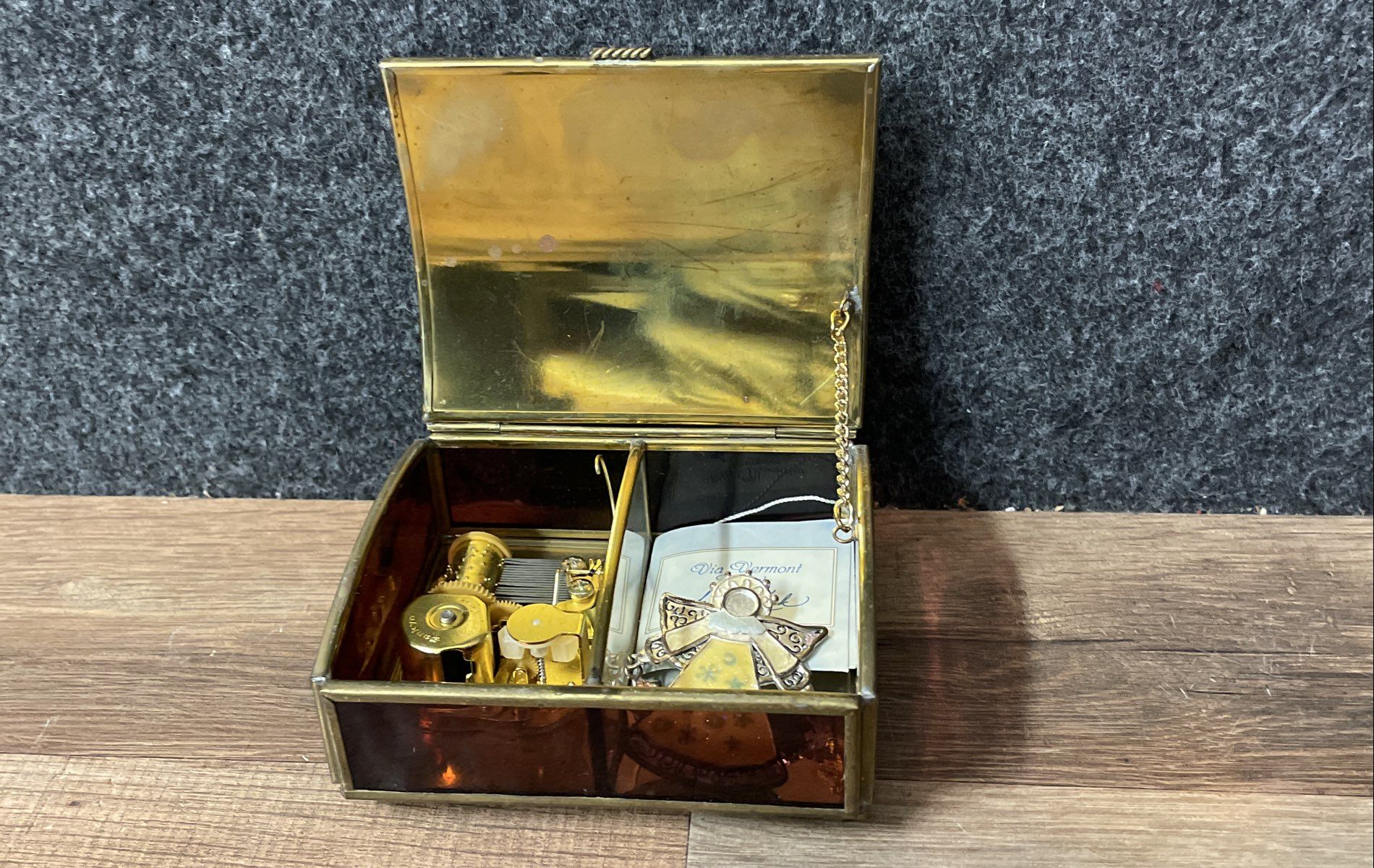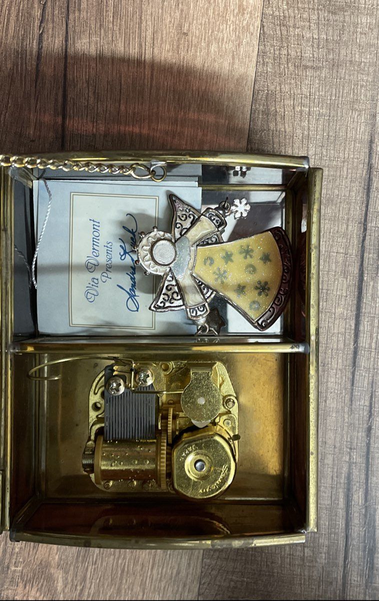 Condition: Used. The music box is in good vintage condition. The brass-tone metal frame shows some minor surface scratches, scuffs, and areas of tarnish consistent with age and use. The faux tortoise shell panels are intact. The glass and artwork on the lid are clear and free of notable damage. The interior is clean. The included angel ornament appears to be in good condition.