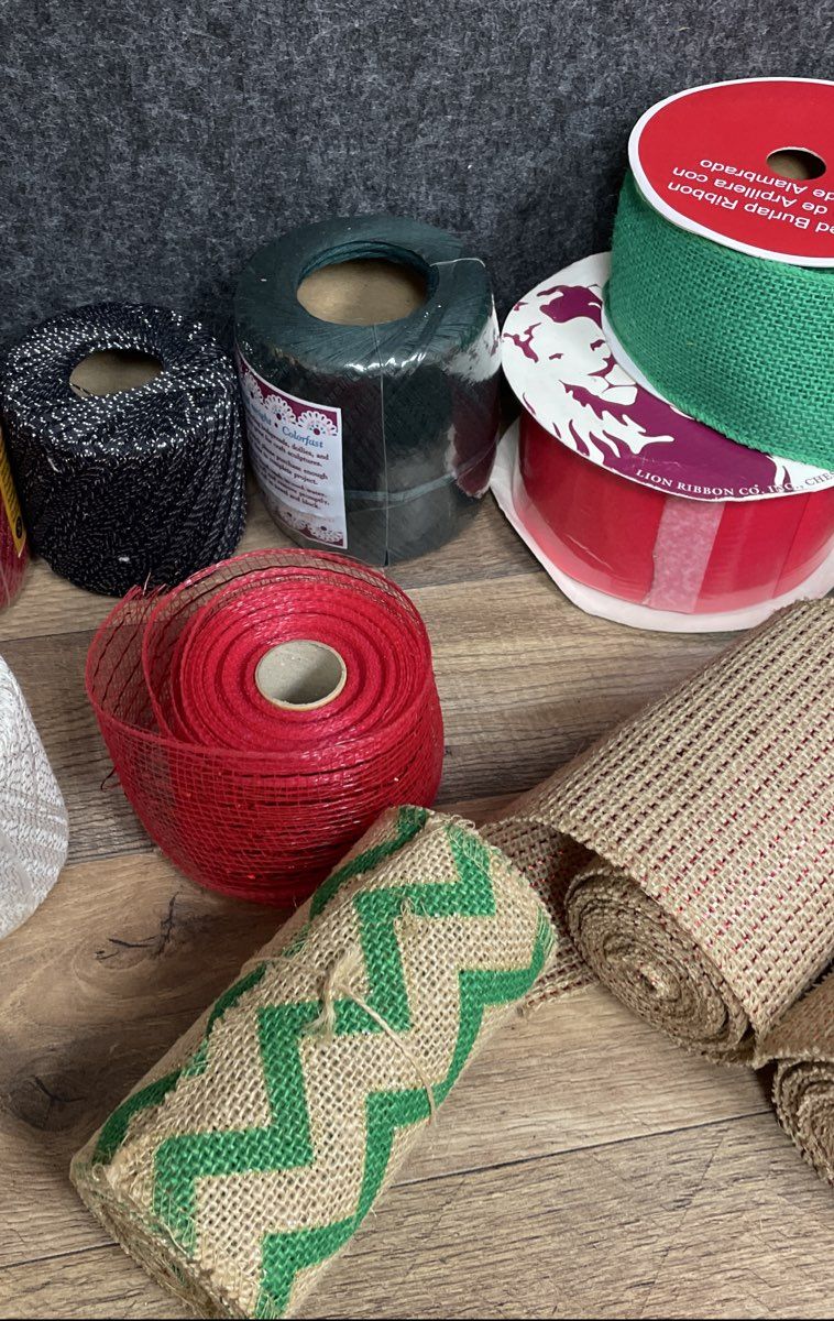 A large 3-pound assortment of craft ribbon and twine, perfect for holiday projects, gift wrapping, and general crafting. This lot features a mix of vintage New Old Stock (NOS) J&P Coats metallic twine and more modern burlap and decorative ribbons from various brands.