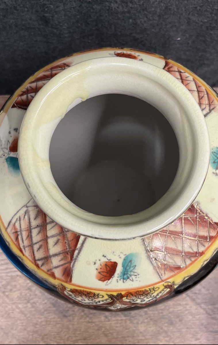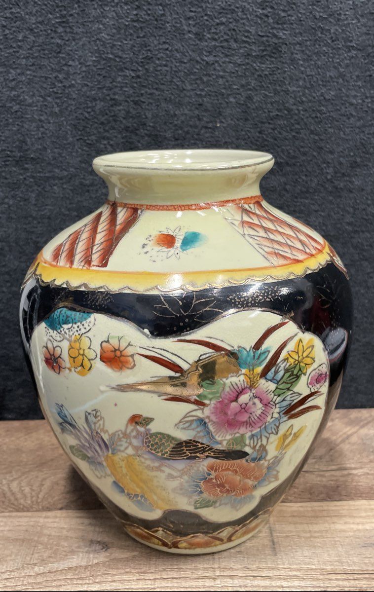 This is a fine example of vintage Japanese export pottery, executed in the traditional Kutani style. The vase features a vibrant, hand-painted scene with pheasant birds amidst colorful florals, rendered on a cream-colored ground with a distinct crazed glaze. The design is highlighted by the use of Moriage, a raised enamel technique that adds texture and dimension, along with extensive gold gilt accents. A wide, glossy black band encircles the shoulder, creating a dramatic contrast. The base bears a red overglaze maker's mark, confirming its Japanese origin.