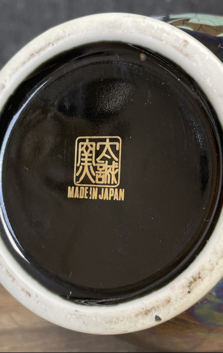 Condition: Excellent vintage condition. There are no visible chips, cracks, or repairs. The iridescent luster finish is vibrant and the floral and bird decoration is clear and well-preserved. The unglazed bottom rim shows minor shelf wear consistent with its age, but does not detract from its display quality.