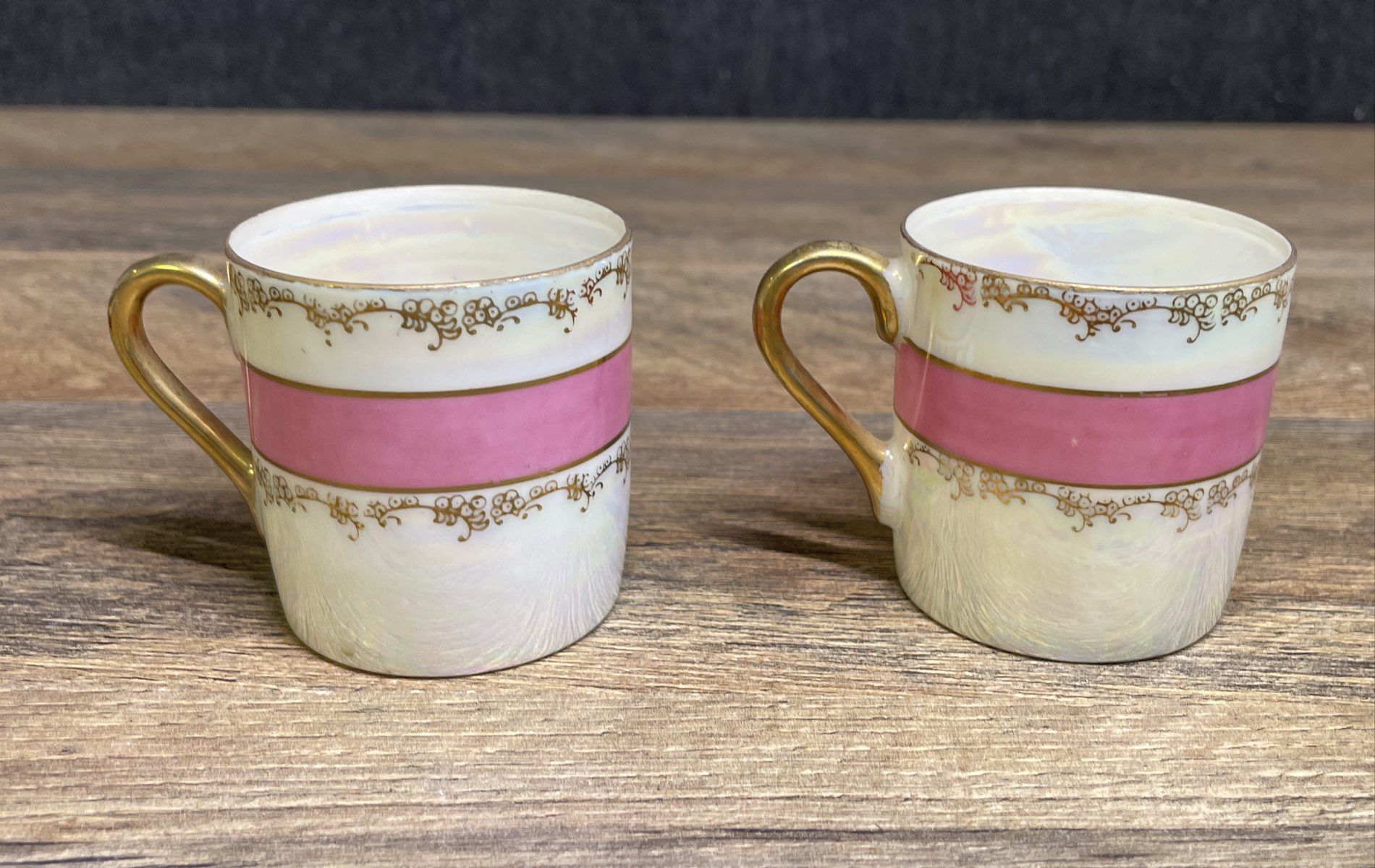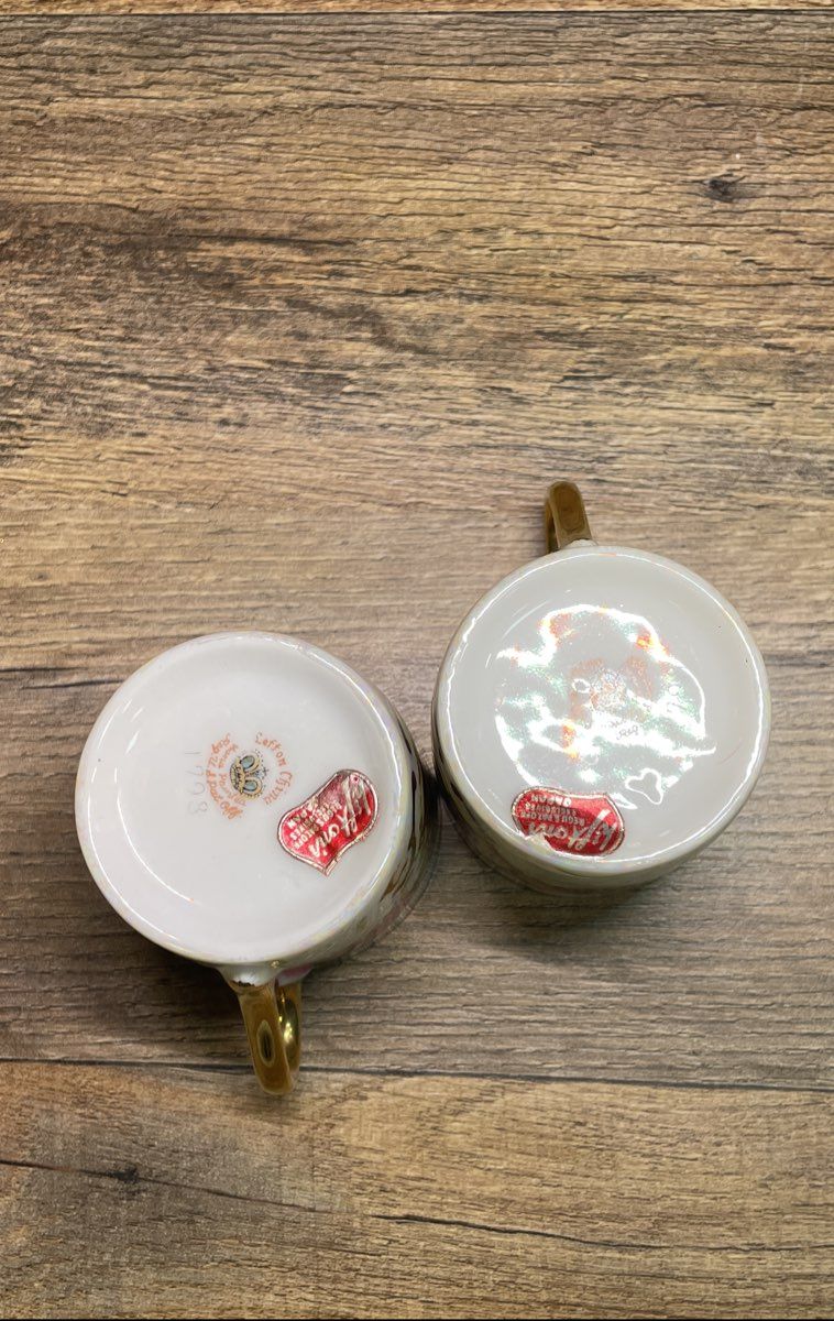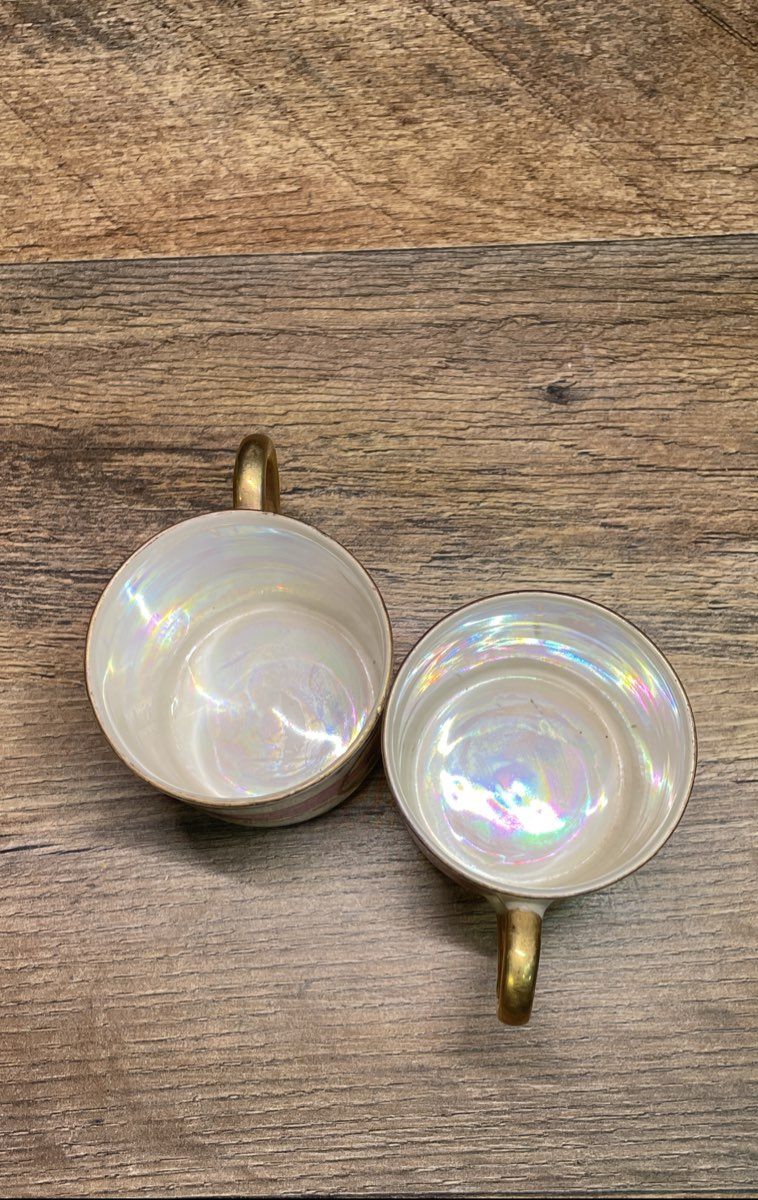 • Interior of cups and surface of saucers have a pearlescent lusterware finish.