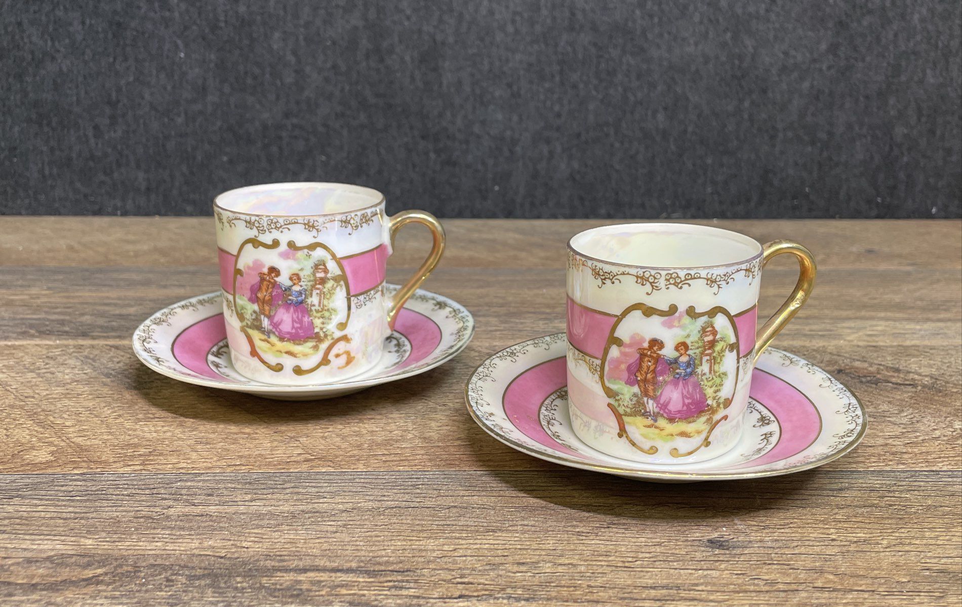This is a set of two matching vintage teacups and saucers by Lefton China, a notable American company that imported high-quality, hand-decorated porcelain from Japan during the mid-20th century. This particular design, #1798, features a romantic Victorian-era courting couple scene set within an ornate gold cartouche. The vibrant pink banding and lustrous interior finish are characteristic of popular decorative styles from the 1950s and 60s.