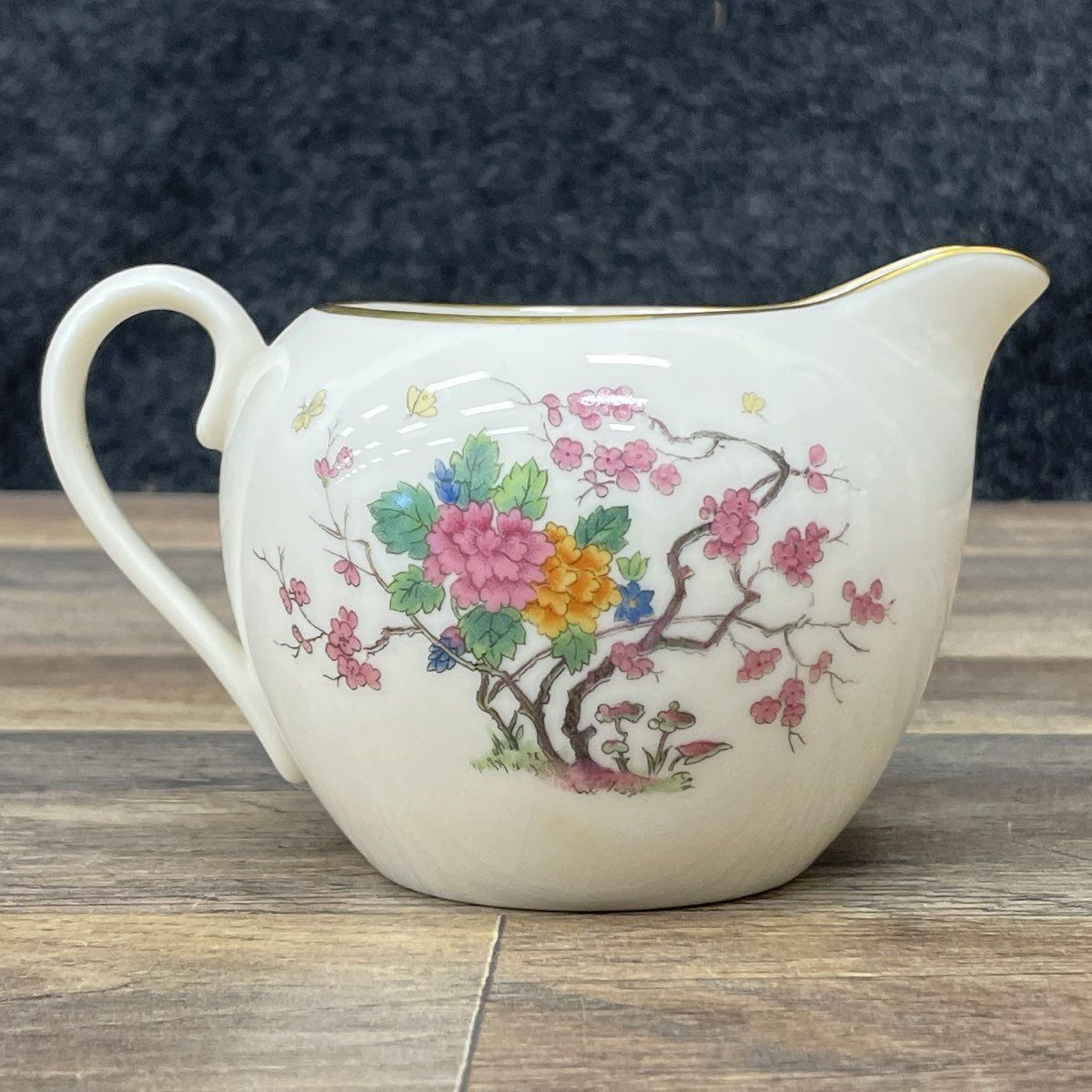 This is a vintage creamer from the classic Lennox Ming Coupe collection, pattern X-300. Produced from 1917 to 1966, this pattern is renowned for its elegant Asian-inspired design featuring vibrant floral sprays, including pink cherry blossoms, set against Lennox's signature ivory china body. The coupe shape offers a smooth, modern silhouette for its time, making it a desirable piece for collectors.