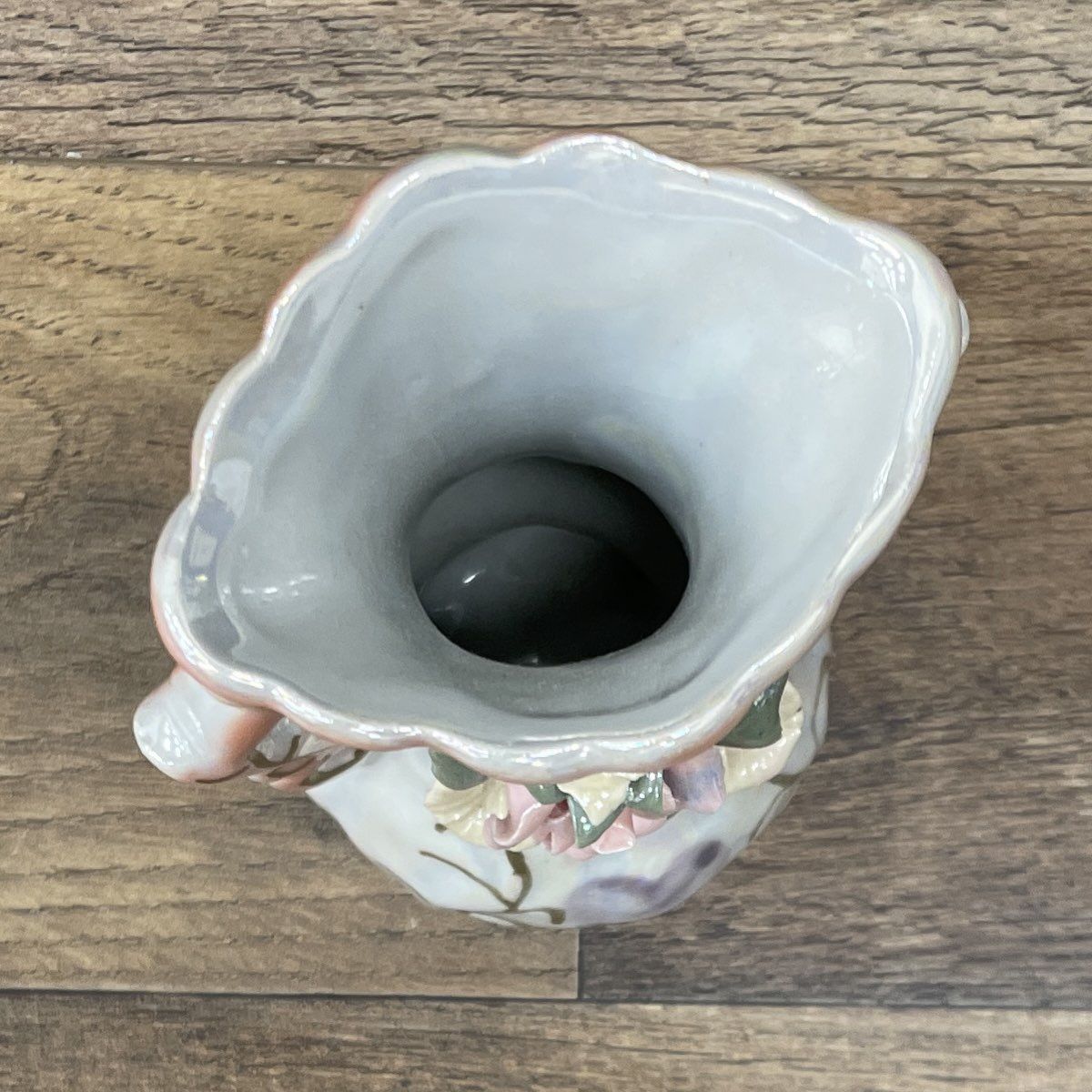 This is a characteristic example of the decorative lusterware that was popular during the mid-20th century. Often produced in Japan for the export market, these ornate ceramic pieces feature a pearl-like iridescent glaze and hand-applied details. This double-handled vase with its three-dimensional floral motif represents a classic decorative style from the era, intended to add a touch of elegance to the home.